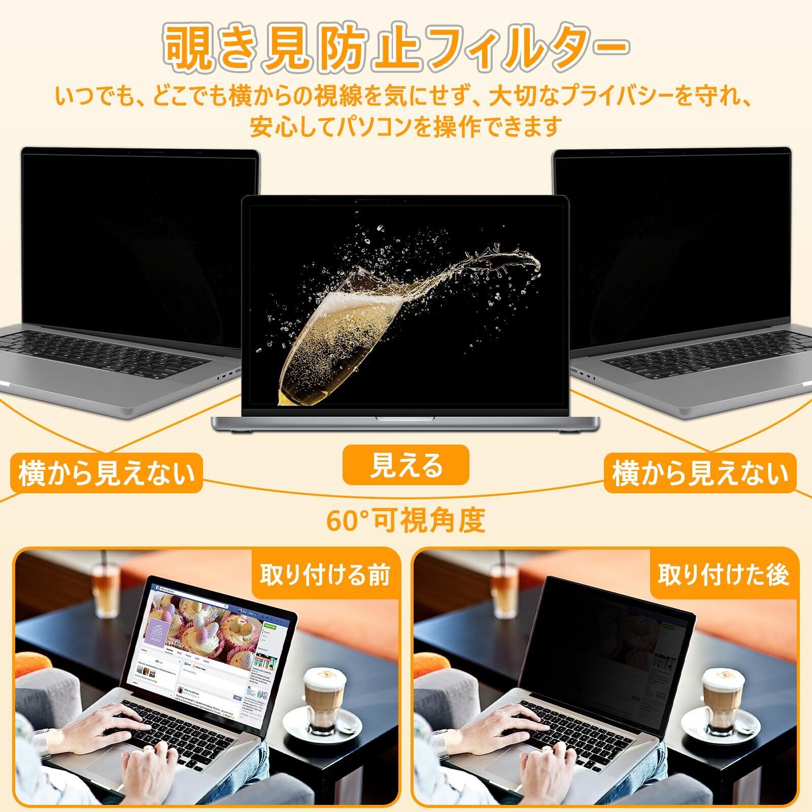 【驚異的なプライバシー保護】 視野角 60度の覗き見防止フィルターです。スクリーンの正面からはいつも通り快適に見え、63°以外の角度からは画面が真っ黒に見えますので、周囲の人からの覗き見を防止します。新幹線やカフェなどの場所で作業をしていても情報の漏洩リスクを回避し、プライバシーをしっかり守ります。どこでも、いつでも安心してご使用いただけます。