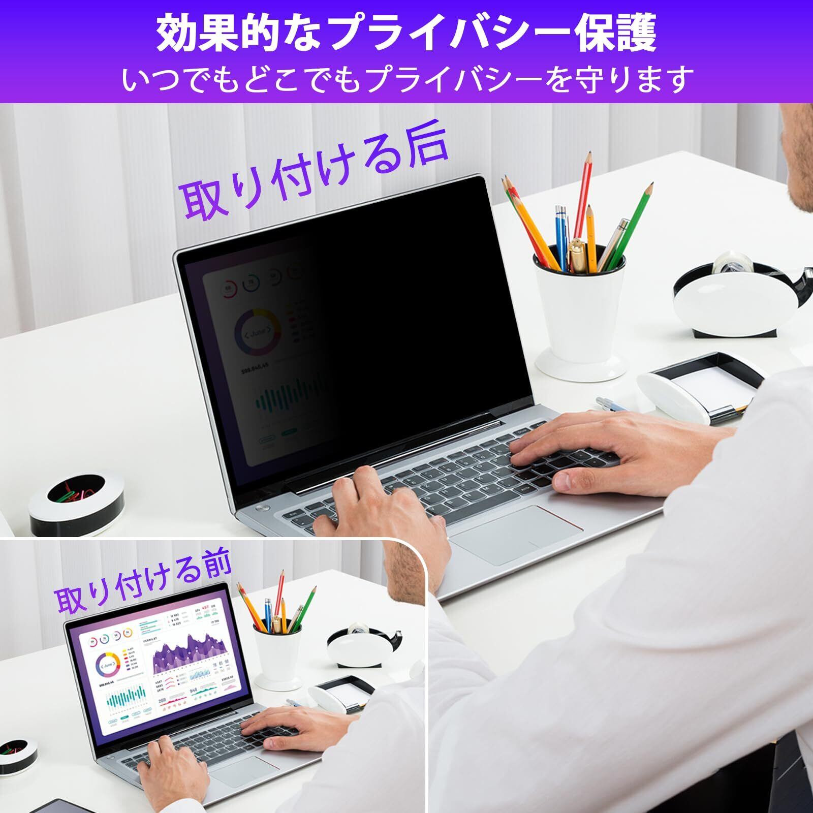 [強化型プライバシー保護] 正面からの視認性を保ちつつ、側面からの覗き見を防ぐことができます。約60度の視野角(左右30度)を越えると画面が暗く表示されるため、情報漏えいを防止する覗き見防止フィルターです。スクリーンフィルター、目隠しシート、セキュリティフィルムとして仕事・学習・移動時に最適です。