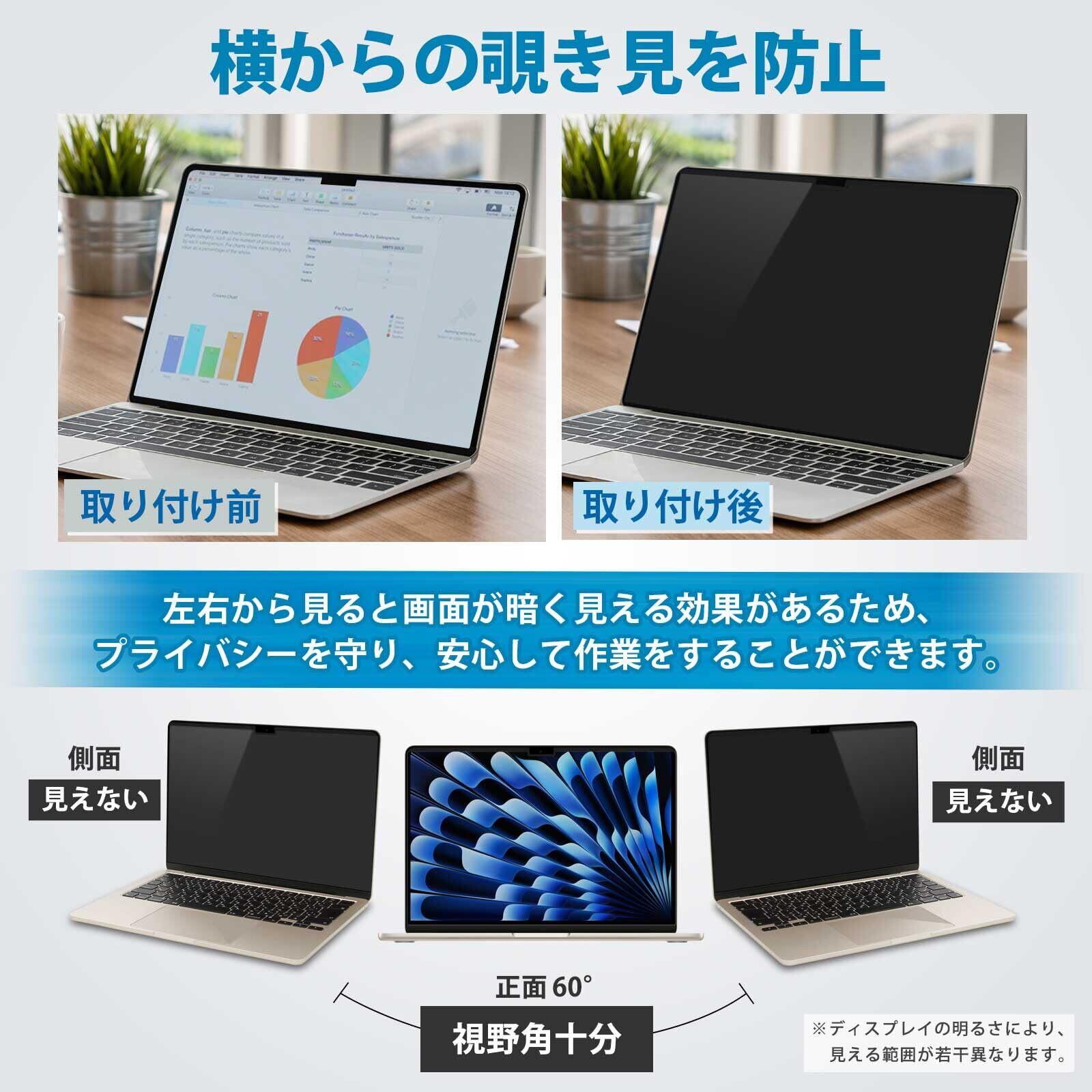PCフィルター専門工房 覗き見防止 Macbook Air 13.6 インチ 2025 M4 M3 M2 対応 フィルム マグネット式 プライバシーフィルター 着脱式 反り防止タイプ 液晶 保護フィルム ブルーライトカット アンチグレア のぞき見防止 反射防止