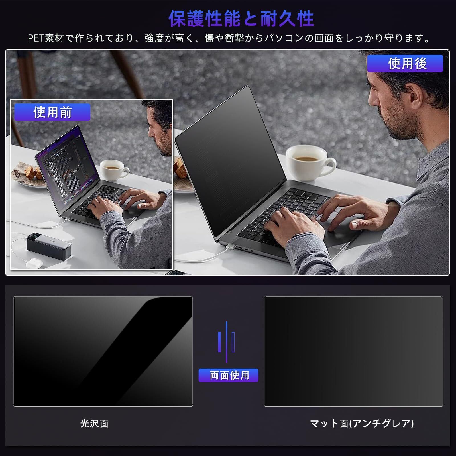 使用感と利便性:の覗き見防止フィルムは、視認性とプライバシー保護の両立を実現します。マット面は指紋が付きにくく、反射を抑えて画面の視認性を高めて、アンチグレア効果により長時間使用しても目が疲れにくい設計です。一方、光沢面は画面の色彩を鮮明に保ち、映像や写真の美しさを引き出します。両面の選択肢があるため、シーンに応じて使い分けることができ、快適な操作性を提供します。