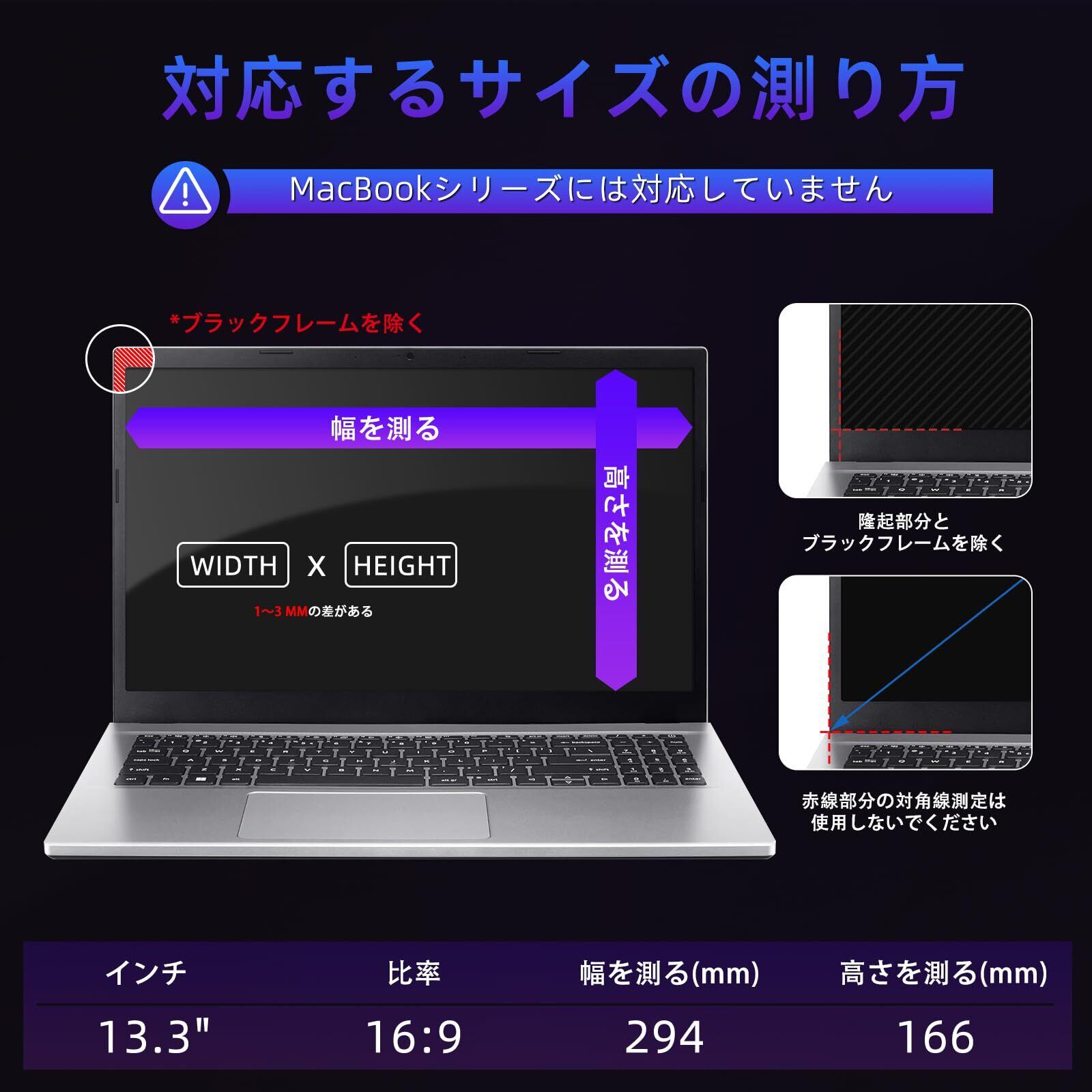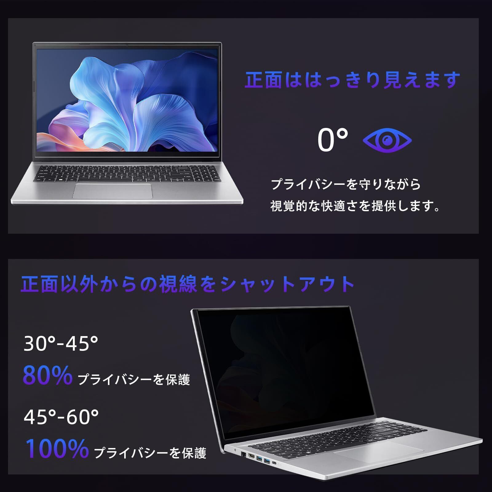 完璧なプライバシー保護:13.3インチ、16:9(幅:294mm高さ:166mm)対応の覗き見防止フィルムで、スクリーンをのぞかれる心配を軽減します。視野角60度に制限し、正面以外からの視線をシャットアウトします。ご注意:フィルターのサイズには表示されている寸法と1~3mmの誤差が生じる場合がありますが、取り付けや通常の使用には支障ありません。