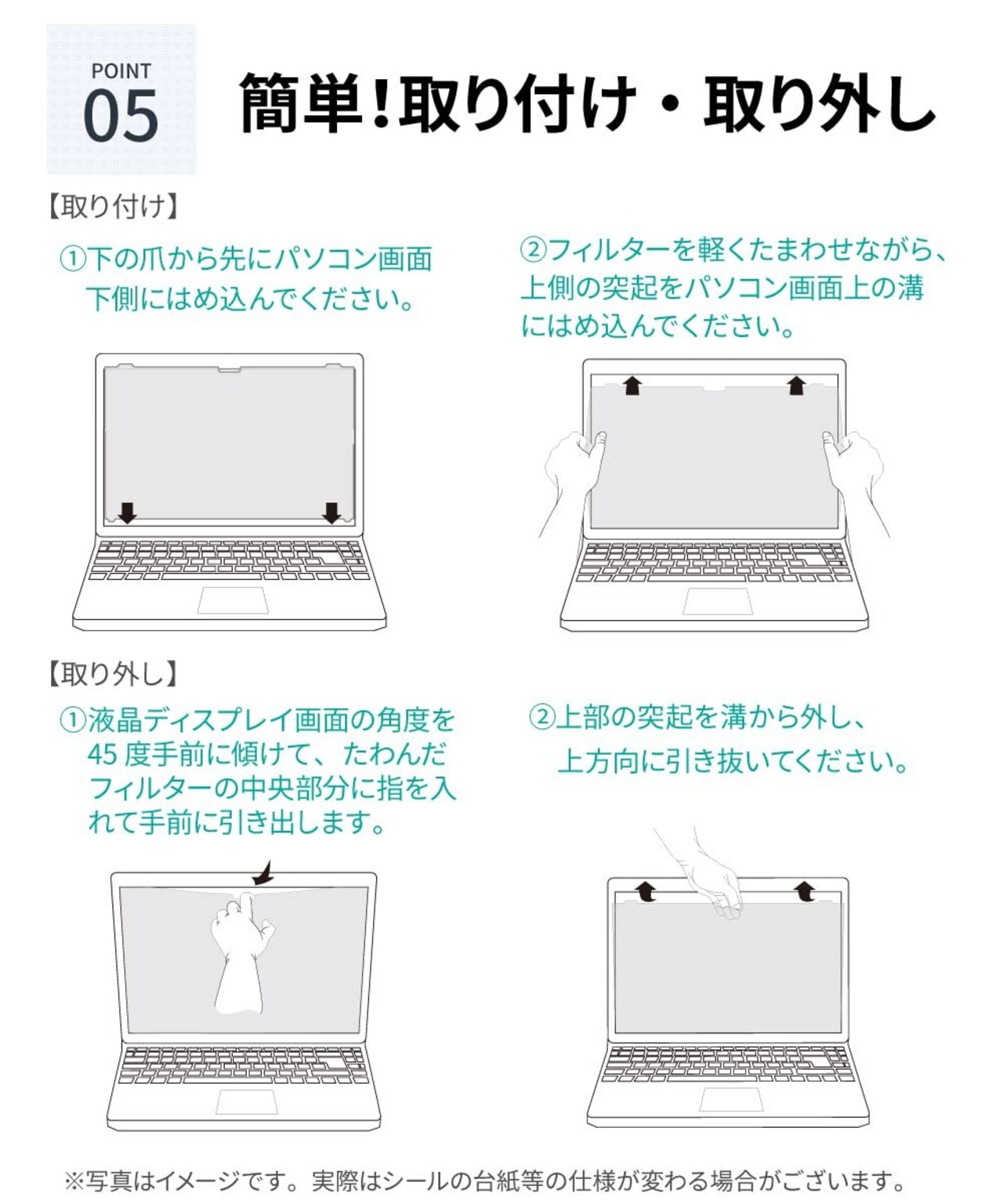 [ はめ込み型 ] 取り外し・取り付けが可能。 フィルターの突起をパソコン画面の溝にはめ込むだけ簡単装着!外すときは上部のつまみを持って手前に引いて取り外しができます。 ※高い加工精度でカットされているため、しっかりと画面に装着されます。 頻繁にフィルターを取り外すことを想定している場合は、マグネット式または汎用式をご検討ください。商品ページは別にございます。「LOE 覗き見防止」 でご検索ください。