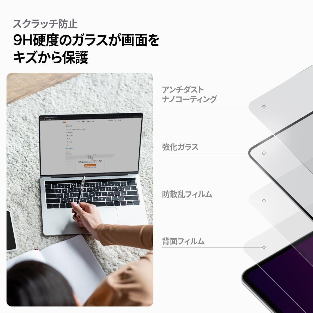 薄い・強い・滑らか ; 硬度9H以上で傷つきにくく、側面は曲面加工されており、滑らかな手触りでガラスの厚さが気になりにくく液晶画面の全面をしっかりと保護します