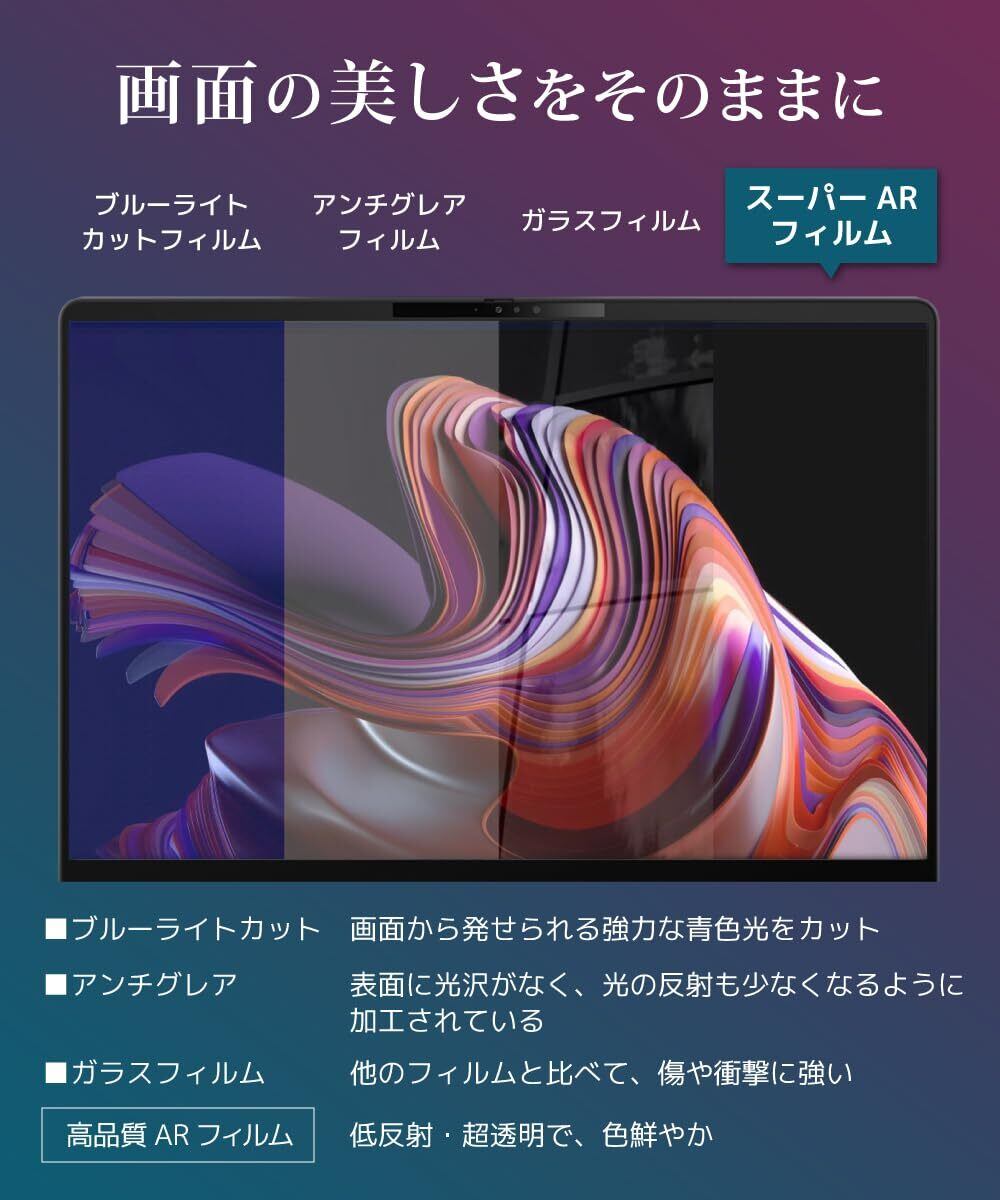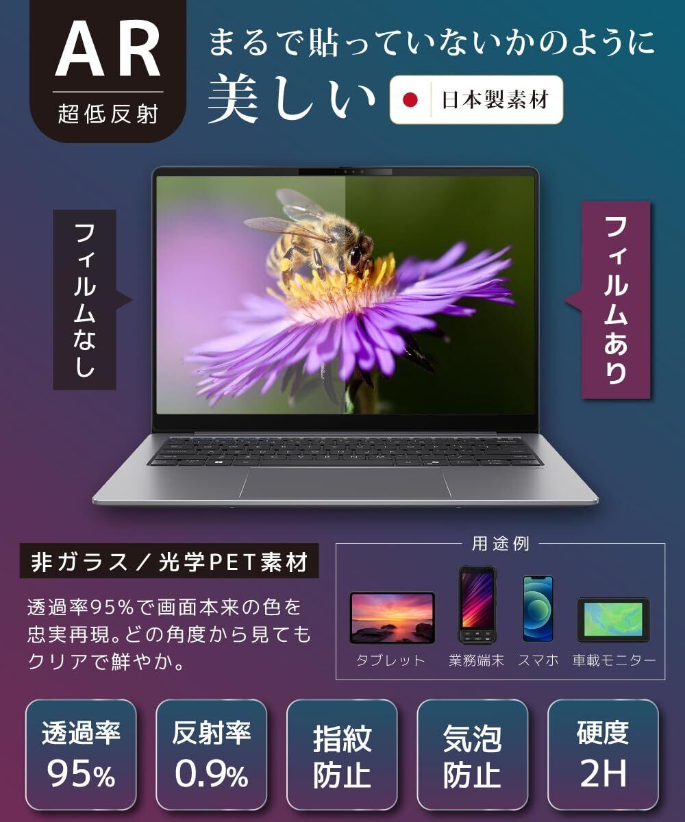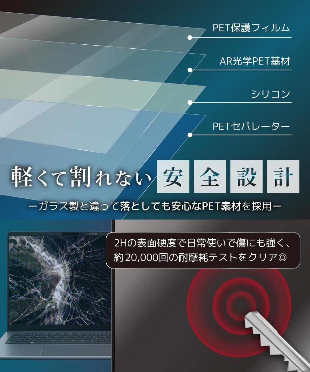 【高硬度】 厚さ0.125mmで表面硬度3Hと強靭。スーパーARフィルムはスクラッチ(傷)にも強く、スクリーンの擦り傷防止用にフィルムを貼っているだけでも安心です。 (参考:最新のノートPCの液晶面は2H程度 )