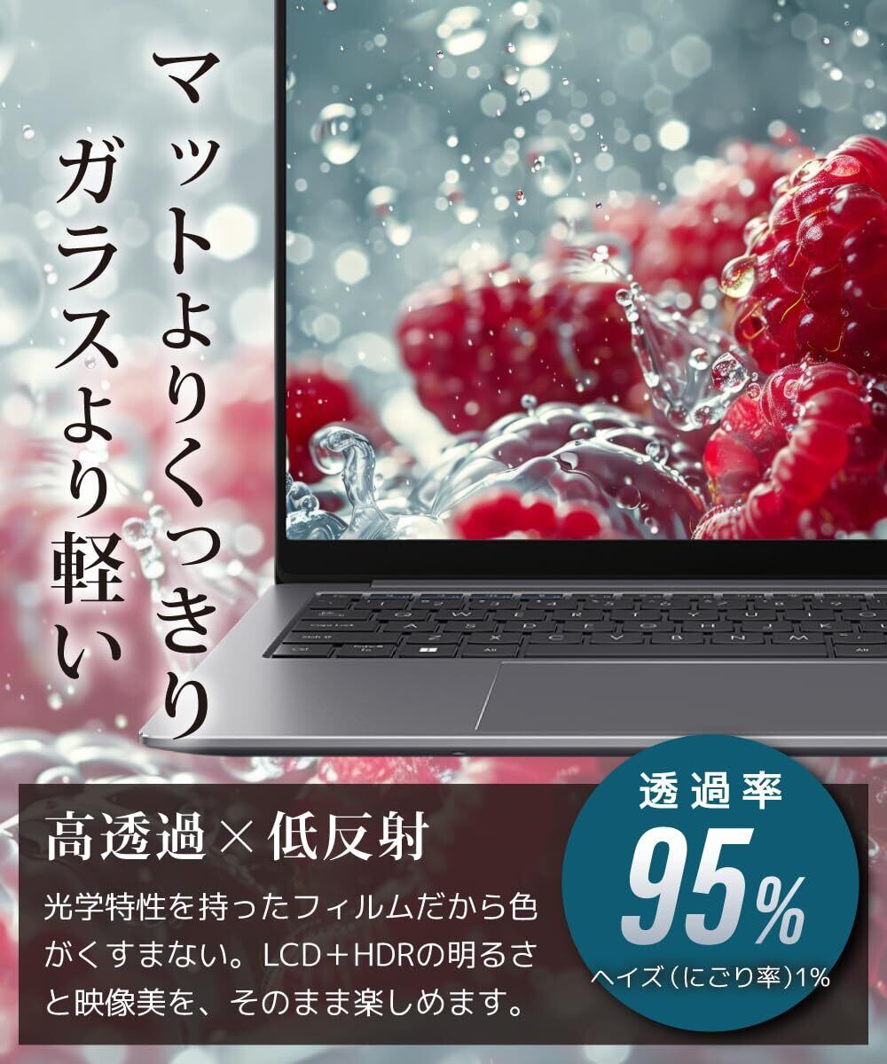 【極低反射】 反射率1.1%と通常の光沢フィルムやガラスフィルムよりも反射が抑えられ、窓際や蛍光灯の多い場所での作業を快適にします。(※液晶仕様本来の反射率以下に映り込みを抑えることはできません。映り込みを完全に防ぐ目的でフィルムをお探しの場合はアンチグレアフィルムをご検討ください。)