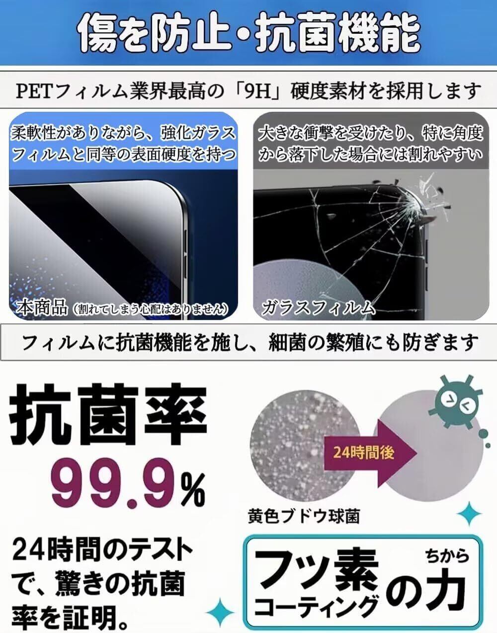 指紋防止 :フィルム表面の指紋防止加工により指紋や汚れが残りにくくなります。水や汚れ、油分をはじくため布などを用いて拭き取るだけで、画面をきれいな状態に保ちます