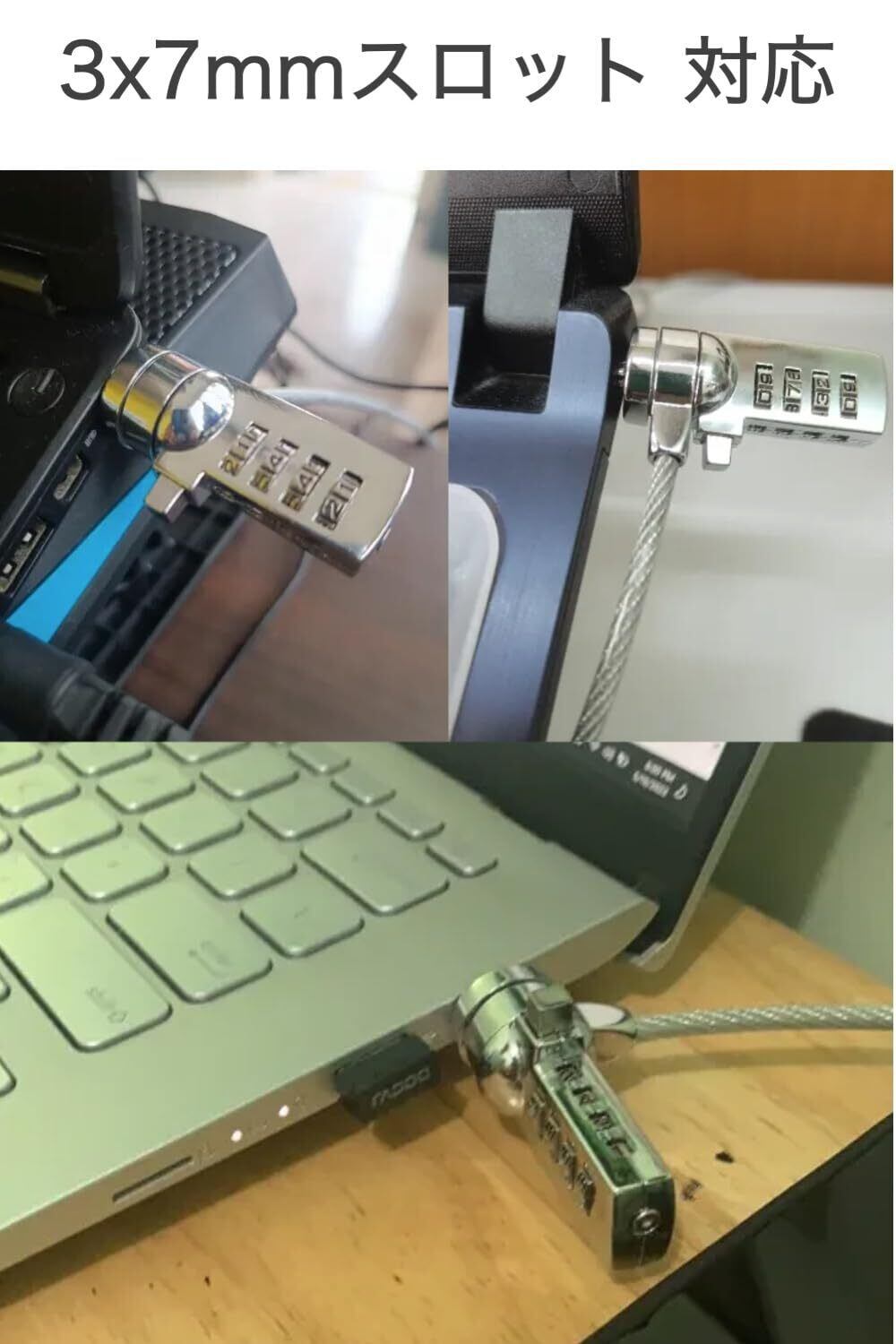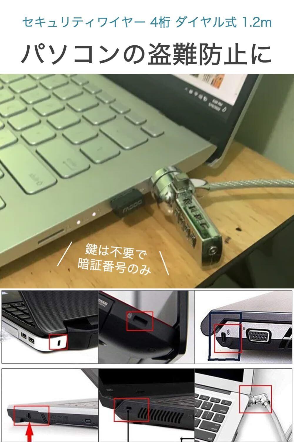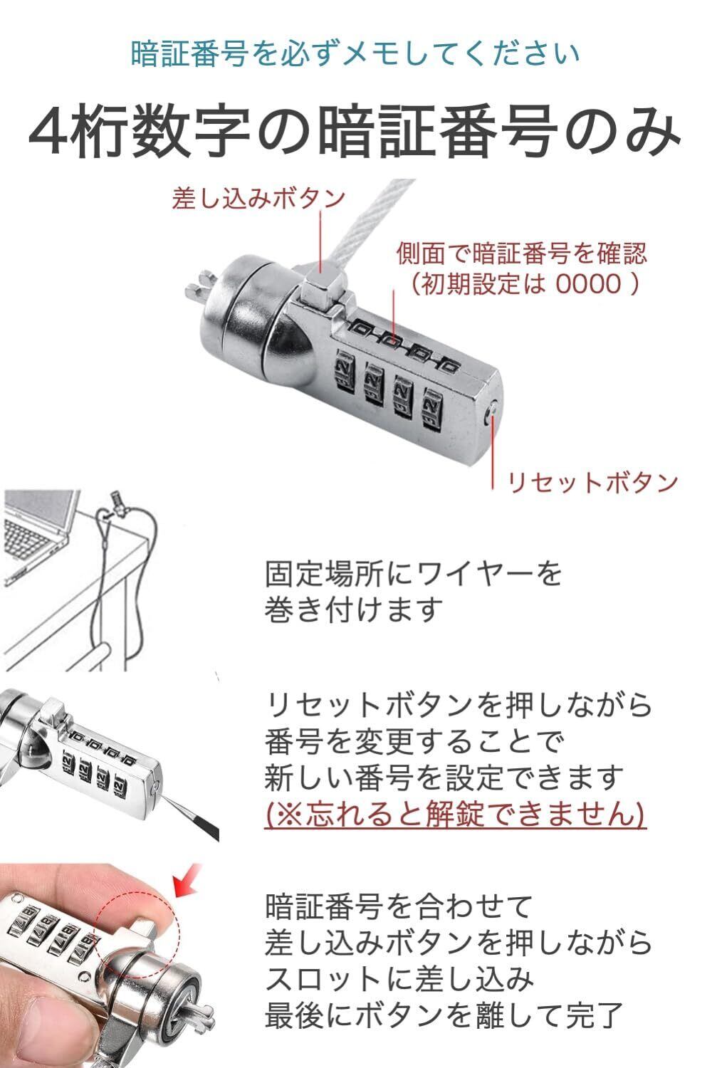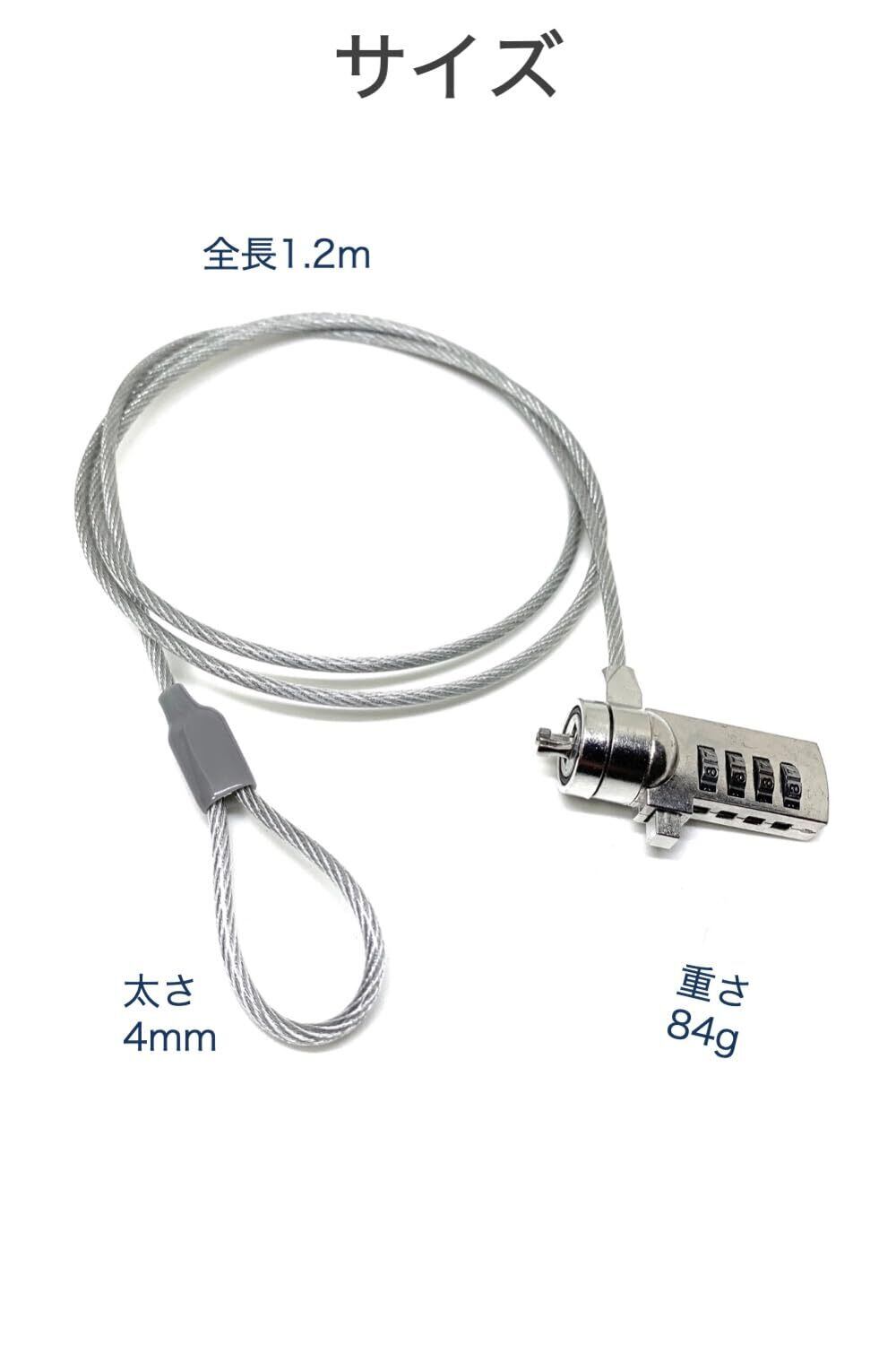 セキュリティワイヤー 4桁 ダイヤル式 長さ1.2m ノートパソコン 3x7mmスロット 対応 暗証番号のみで解錠、鍵が不要 パソコンの盗難防止に