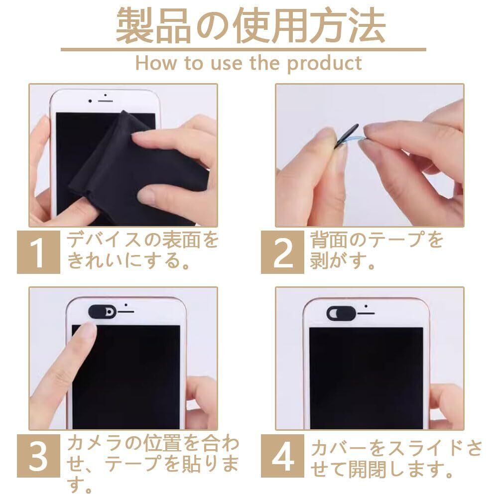 【使用方法】カメラカバーは4つのステップで使用します。 1 本体の表面をきれいに磨きます。 2 背面の保護フィルムをはがします。 3 カメラの位置を合わせてから取り付けます。 4スライダーを押して操作します。