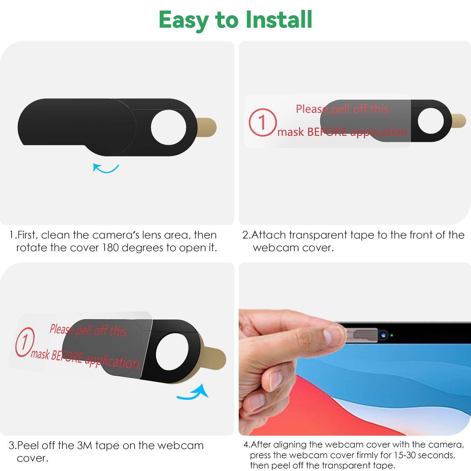 【 取り付けと使用が簡単】: わずか 4 つの簡単なステップで、カバーを貼り付け、位置を合わせ、押し、スライドさせてプライバシーを保護することができます。さらに、ウェブカメラの機能やライトを妨げません。
