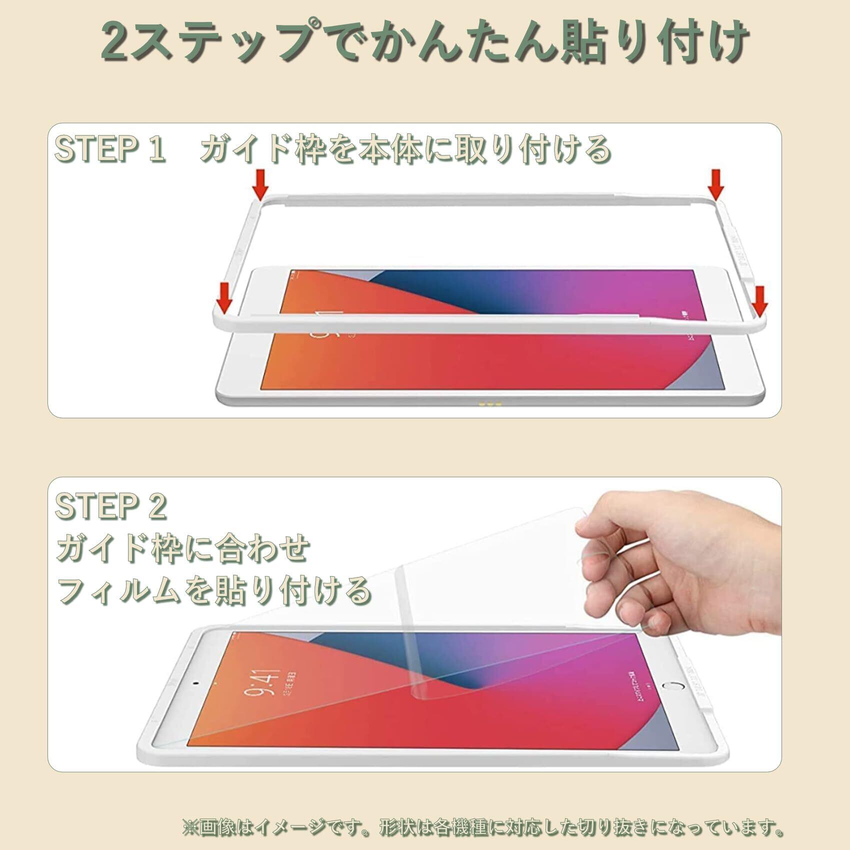 専用ガイド枠付き: お客様が貼りやすいように、専用のガイド枠が同梱されています。ガイド枠をしっかりとタブレットにはめ込み、フィルムをガイド枠のインカメのある側にしっかりとあてて、保護シールを剥がしながら置くだけで、シリコン自己吸着層により、綺麗に密着できます。