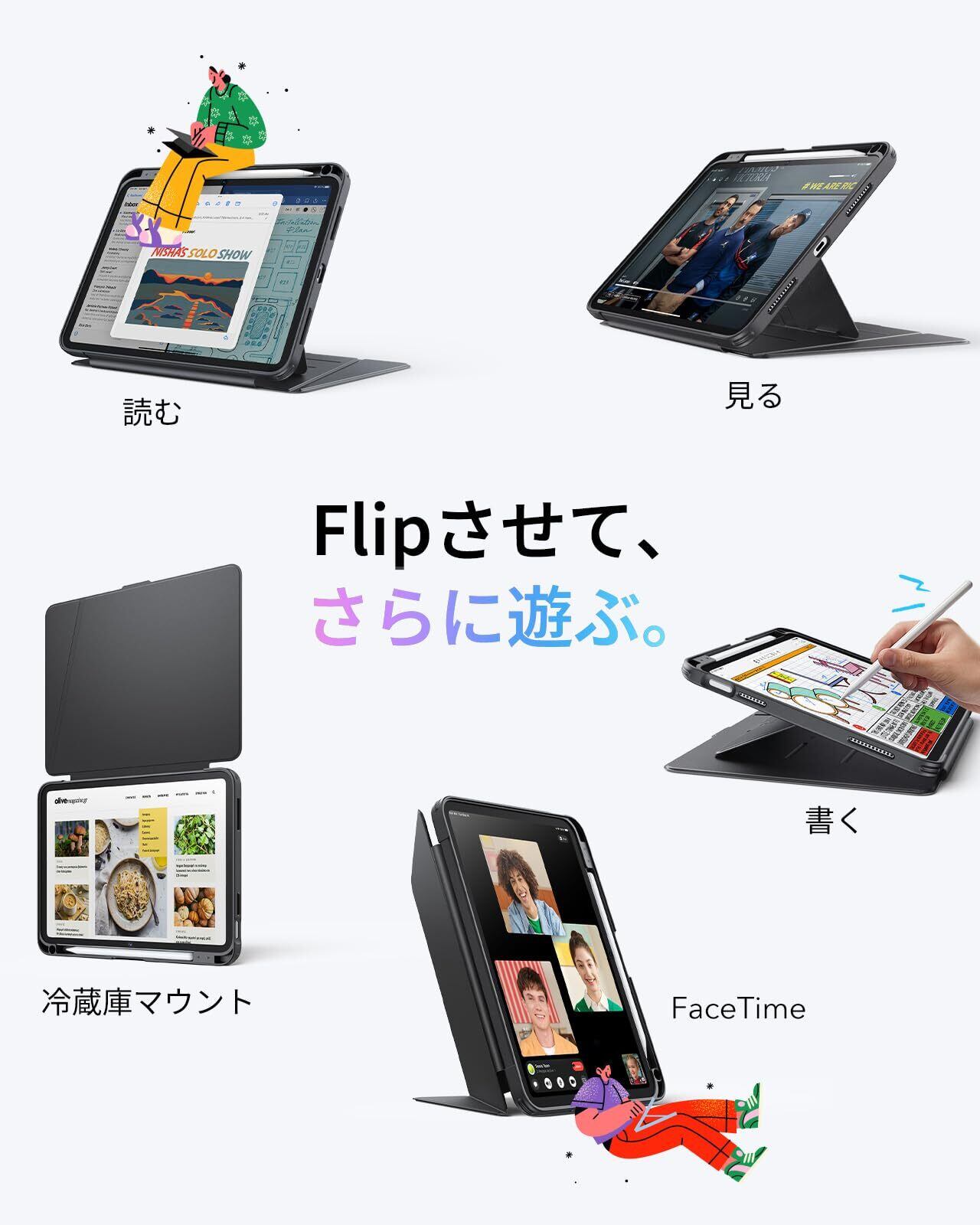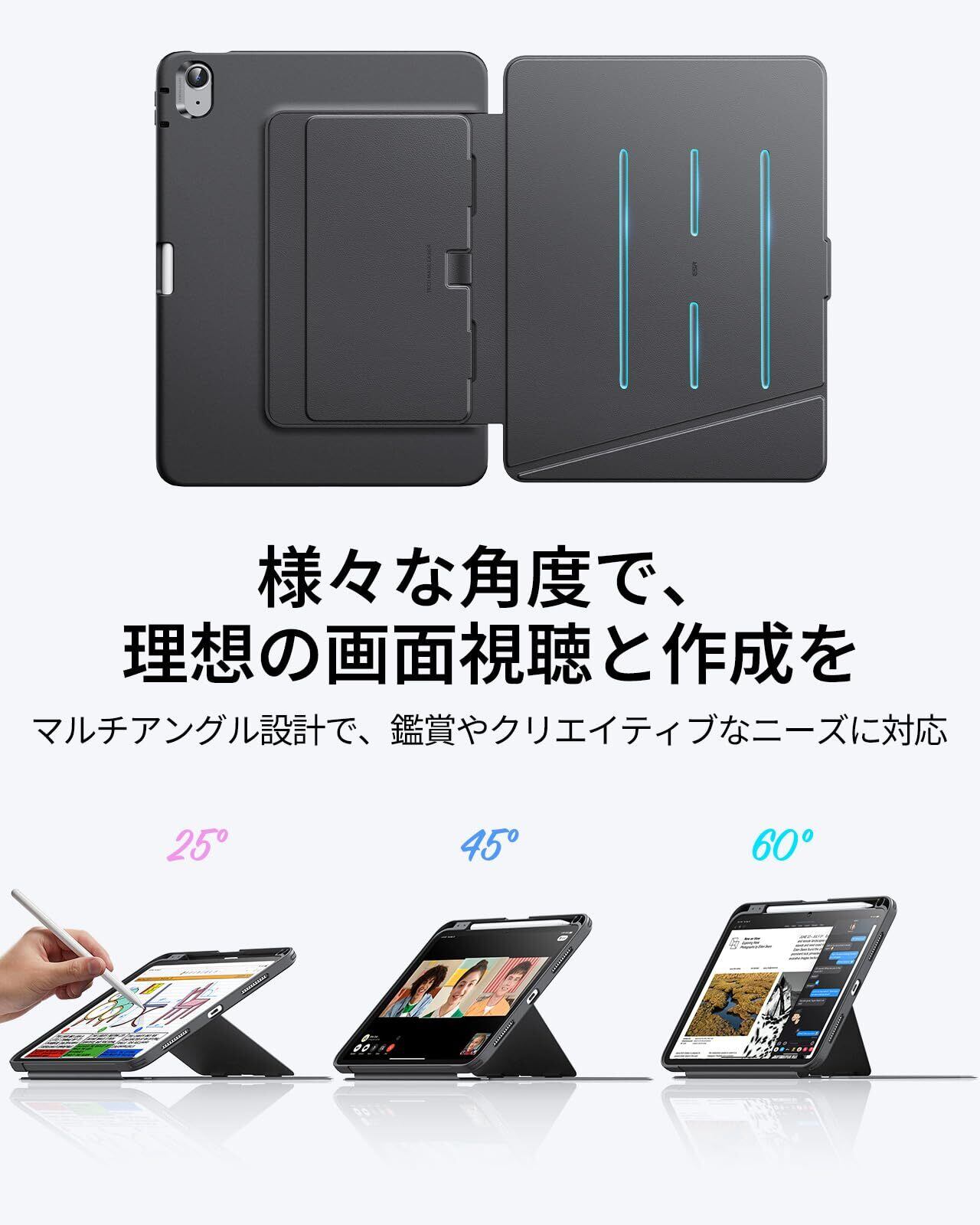 【マルチアングルデザイン】:2つのスタンドモードに対応しており、45°~60°はビデオ鑑賞、作業、FaceTimingなどに最適なビューイングモードへと、25°に調節した場合は執筆、絵画、その他のクリエイティブな作業に最適なライティングモードへと用途に合わせて角度調節が行えます