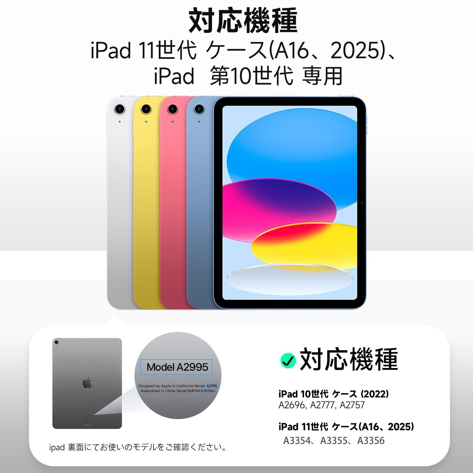 【対応機種】iPad第10/11世代(2022/2025年モデル)専用で、モデル番号A3354、A3355、A3356、A2757、A2696、A2777に対応。購入前にご自身のiPadモデル番号を確認してください。