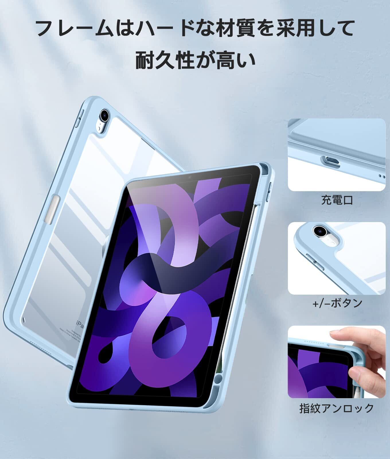 ✫【透明バックカバー】対応iPad air 11インチ ケースの表面はPUレザー素材を利用して、軽量、超薄を備えます。ポリカーボネート素材を採用している透明バックカバーは汚れや傷つけなどを防止するだけでなく、対応iPad本体の色と美しさも活かせます。透明バックカバーの枠は柔軟な TPUを採用して、取り付けも簡単にできます。フロントカバー内部材質はマイクロファイバーで、摩擦によって発生する傷を抑え、液晶画面を保護しきれいに保ちます。