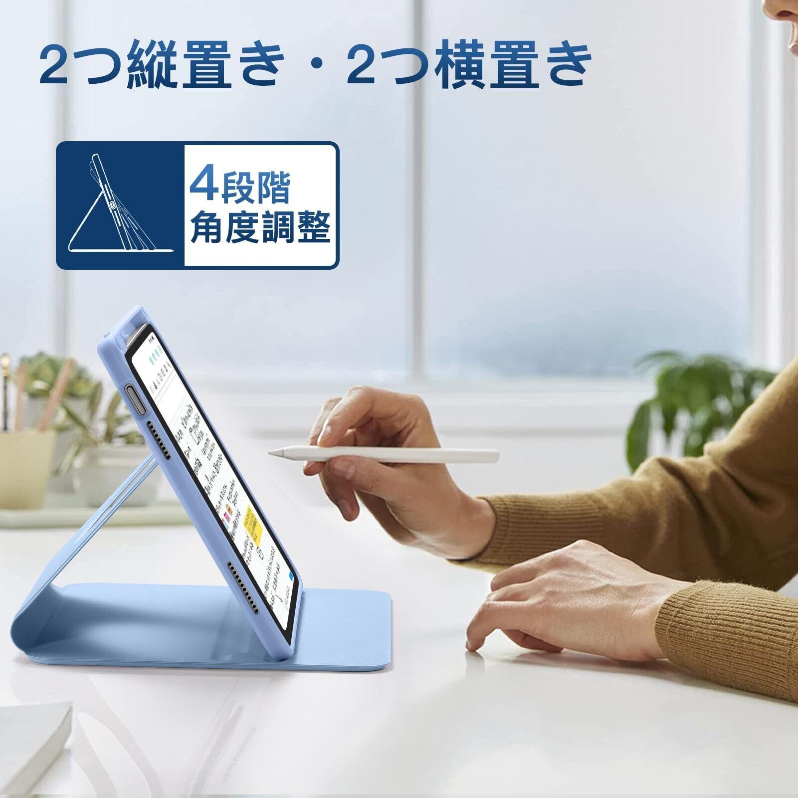 【360°自由回転】360度回転可能なデザインは、対応ipadを横向きと縦向きの両方で使用できるようにし、2つの滑り止めの溝は、ipadにより多くの異なる使用モードを提供します。 様々なシーンに対応し、使い方をよりシンプルで簡単なものにします。
