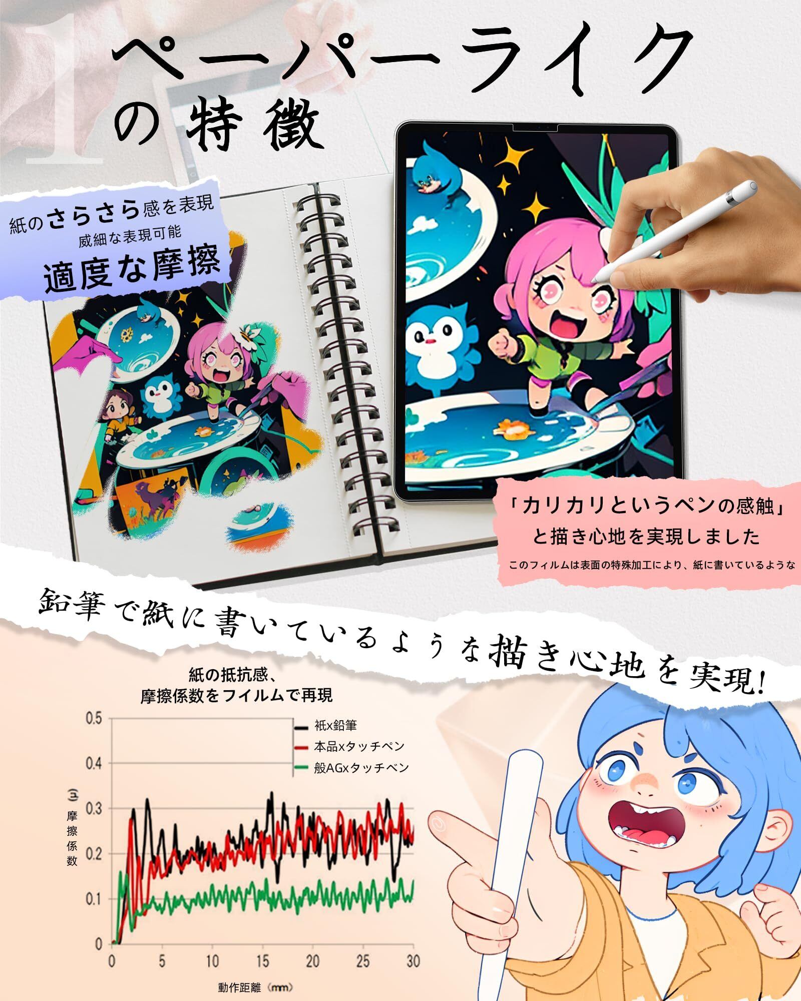 【上質紙のような描き心地を忠実に再現】純日本素材を採用し、表面特殊な可能により、紙に鉛筆で描いた時の触感を再現します。上質紙に近い描き心地を追及しました。イラストを描く、メモを取る、画像を編集するなど、iPad Air 5 の良い使用体験を楽しめます。