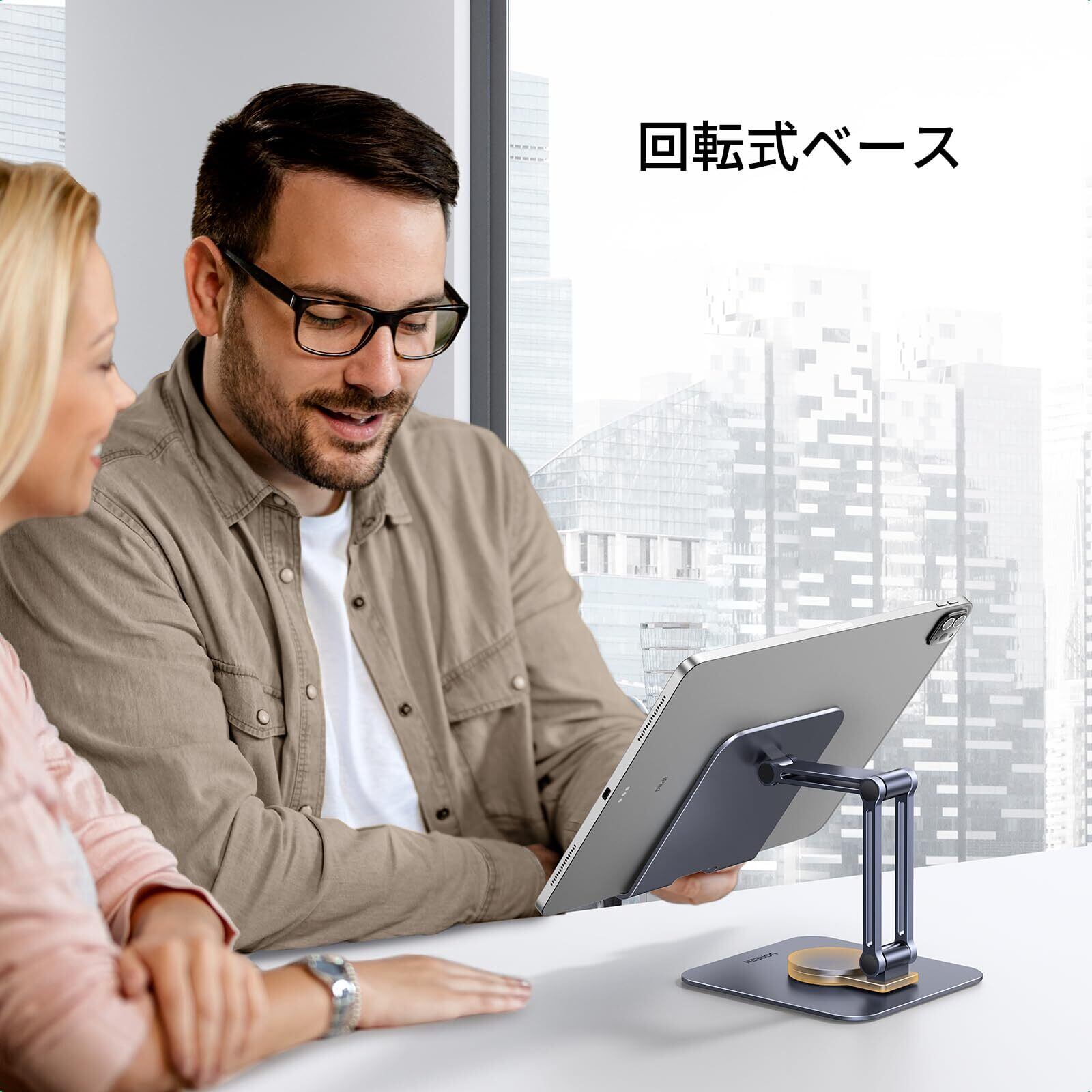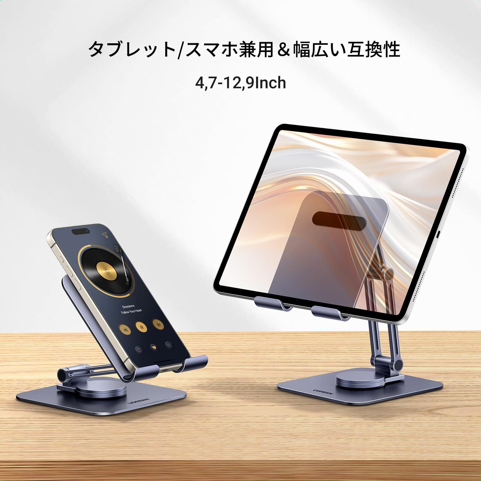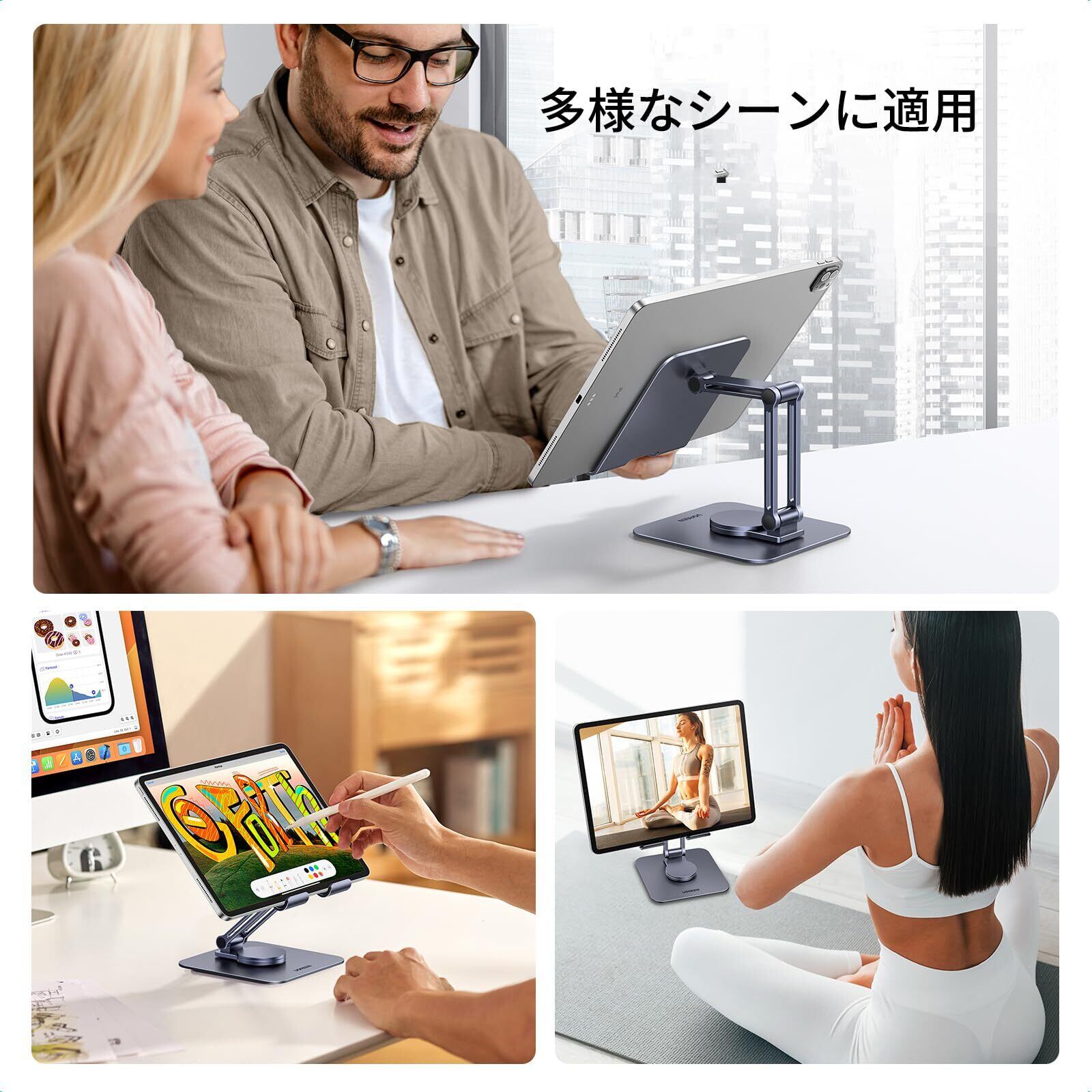 【革新的360°ベース回転式スタンド】スタンドを動かさずに360度自由に角度を調整できます。 手で触れるだけで必要な角度に回転します。UGREENタブレットデスクは二軸アームを備えており、iPad/iPhoneを目と平らな位置に引き上げ、快適な視聴体験を実現し、首/背中の痛みを大幅に軽減することができる。