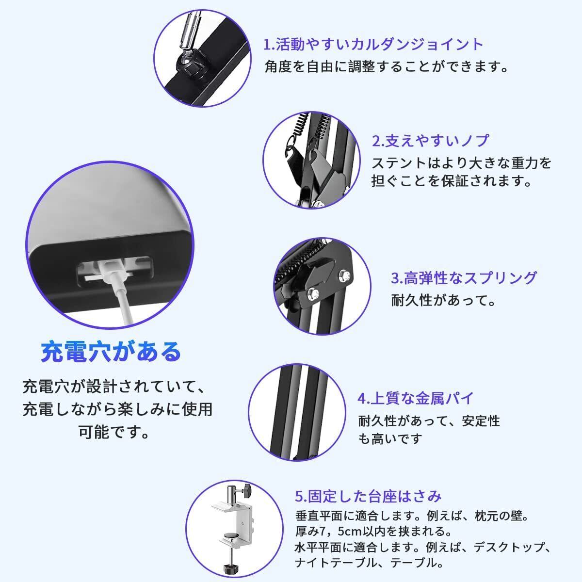 【四つの回れる関節、自由に調整できる&両手を解放し】 最新のスタンドは四つの回れる関節と自由に回る金属ダブルボールを備えて、普通なブラケットより、一層柔軟になります。4段式のアームとボールジョイントで角度を自由に調整でき、一般的なアームよりも自由度が高く、より好きな角度に固定でき、最も快適な視角を調整できます。使わないときには折りたたんでおけます。