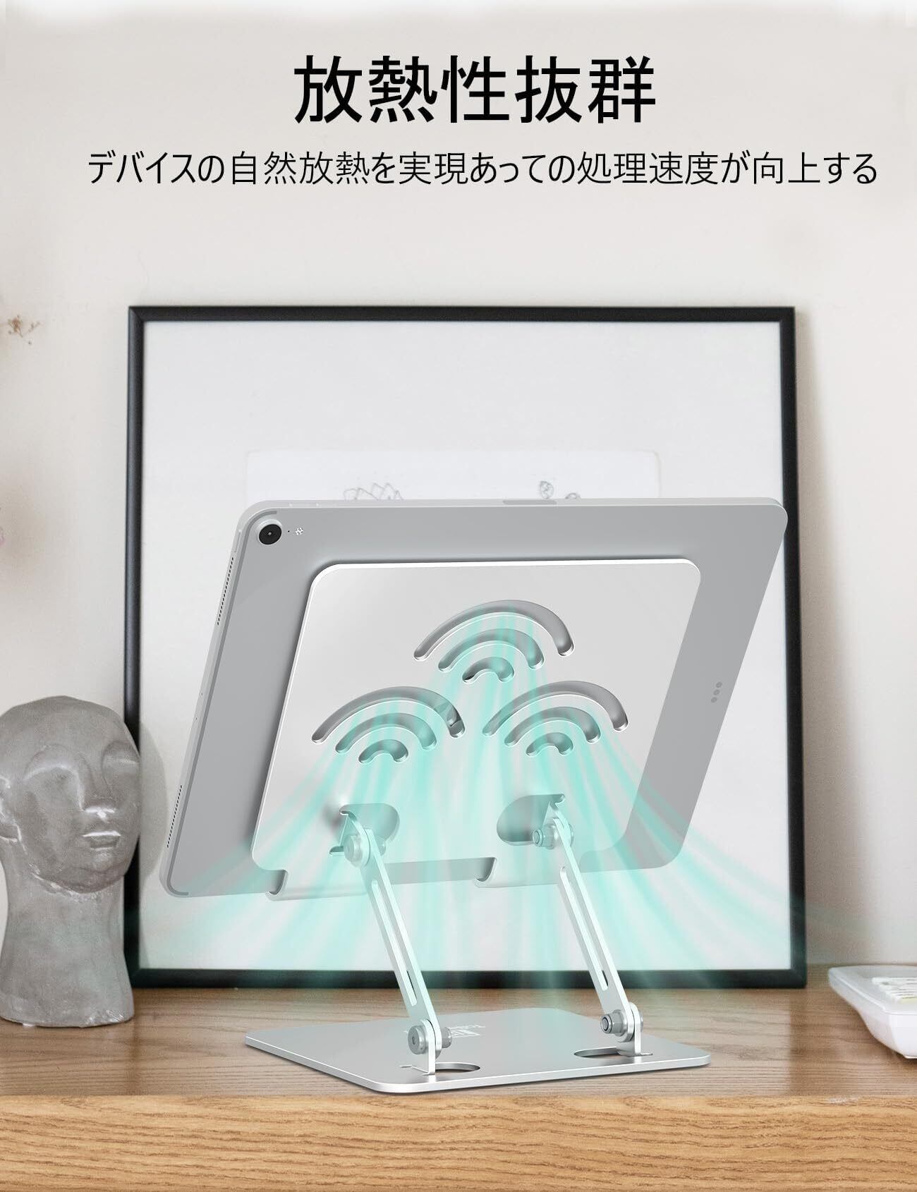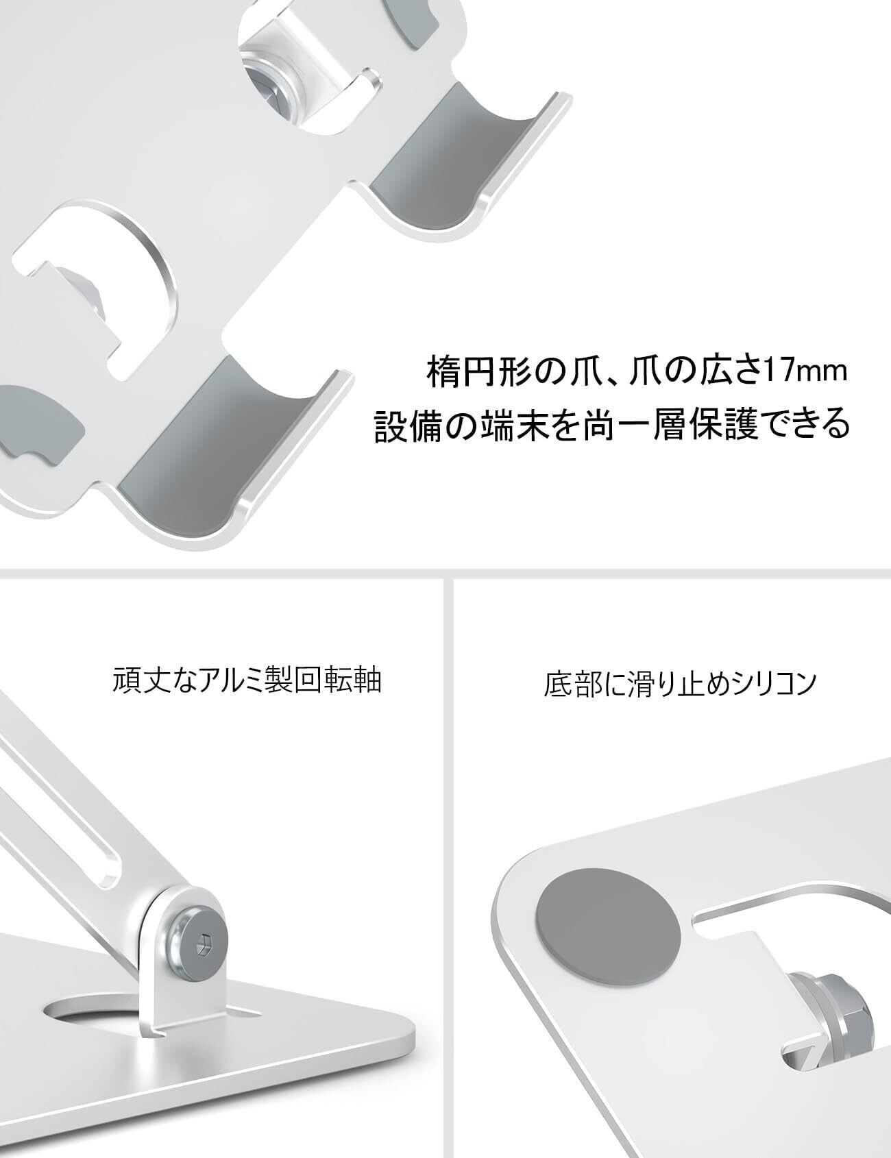 【安定性&放熱性抜群】アルミ合金製なので、本製品は約0.3KGで、持ち運び便利でスペースを節約できます。台座の裏面、底面にも滑り止めゴムがあり、卓上にしっかり固定でき、スタンドの安定性を向上させます。製品を載せる時、前後揺れを最小限に抑えられ、傷や落下の防止に役立ちます。強い安定性を与えます。そして、熱力学第二法則によって、熱があれば、まず周りに発散します。スタンドの裏面も大きい穴があり、タブレットの自然放熱を実現して、夏場や長時間の使用でも安心してお使いいただけます。