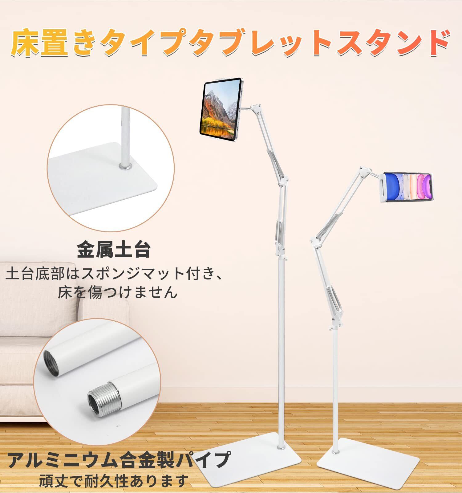 【全金属製・優れた安定性・スポンジマット付き】- 高品質アルミ合金台座とハイプと炭素鋼アームで全体的金属製、堅固なアルミアームのスタンドは超強いスプリングを備えるので、頑丈で揺れなく、安定性が抜群です。最大荷重1.5kg、ほぼいずれかのタブレットやスマホに耐えることができます。タブレットを挟む用クリップ内側は上質なスポンジマットを備えて、更に台座底部もスポンジマットを用意し、使用時に安定性が高くてタブレットと床を損なわないです。