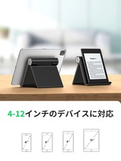 このスタンドは、4インチから12インチまでの幅広いデバイスに対応しています。ABS素材で作られており、頑丈さと軽量で持ち運びやすさを兼ね備えています。タブレットをしっかりと固定し、安心してご使用いただけます。