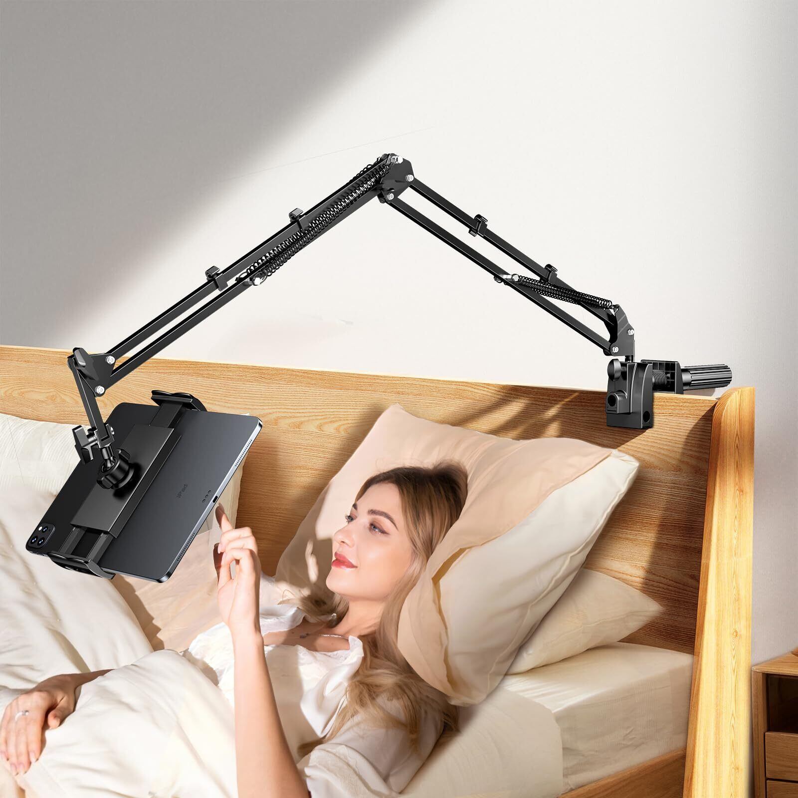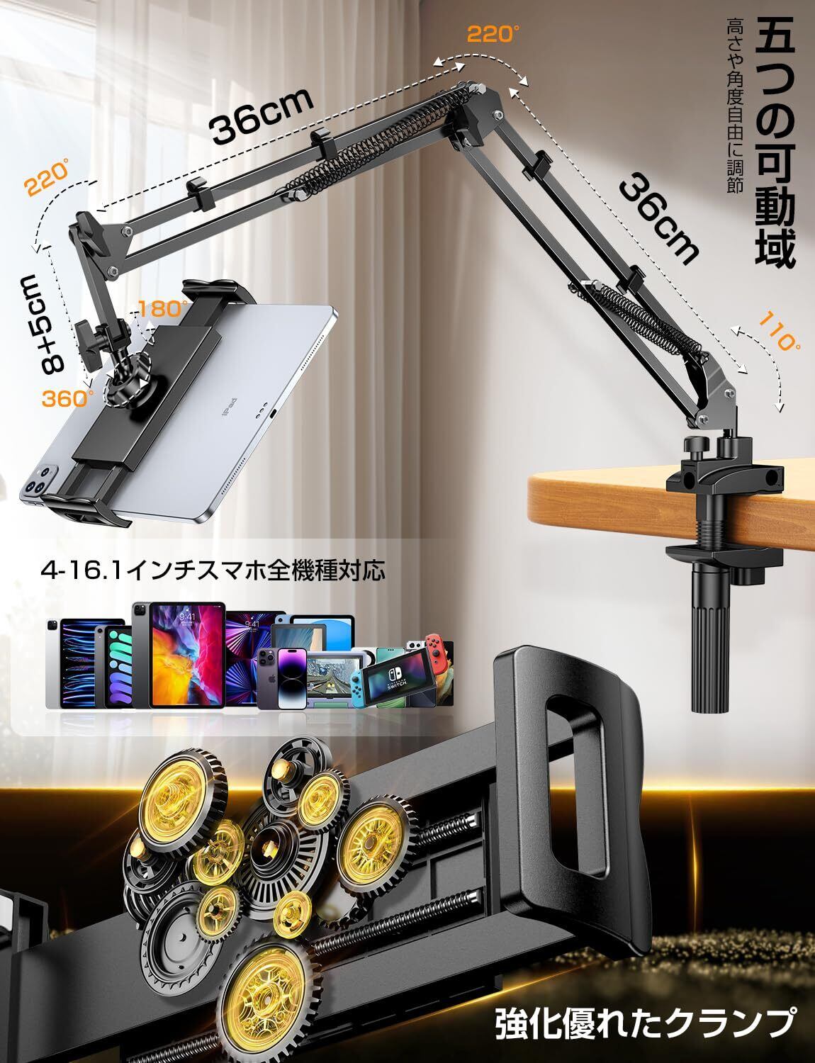 【回れる関節五つ!トップ延長アーム・バリアフリー角度調整】 ▶「五つの可動域・高さや角度自由に調節」新世代型破りな寝ながらタブレットスタンド、革新性と実用性を最優先に製品開発を進めてき、五つの可動域の最高傑作ipad スタンド アームが登場!五つの回れる関節と360°自由に回るボールを備えるにより、可動域はとても自由自在!スマートフォンやタブレットを任意の角度に固定でき、高さをより自由に調節できて、最適な視聴角度と快適さを提供する。▶「220°トップ延長デザイン・目線に合う」業界改良版でスマホスタンドのトップ部分は延長アームを採用し、220度回転可能で方向や角度などを自分好みに自由調整でき、優しいデザインは頚椎や視力を保護するだけでなく、見やすい角度で目線に合わせて近づけたり離したり調整可能。また、スマホを手で持つ代わりに固定することが出来るので、長時間快適に楽しむ。