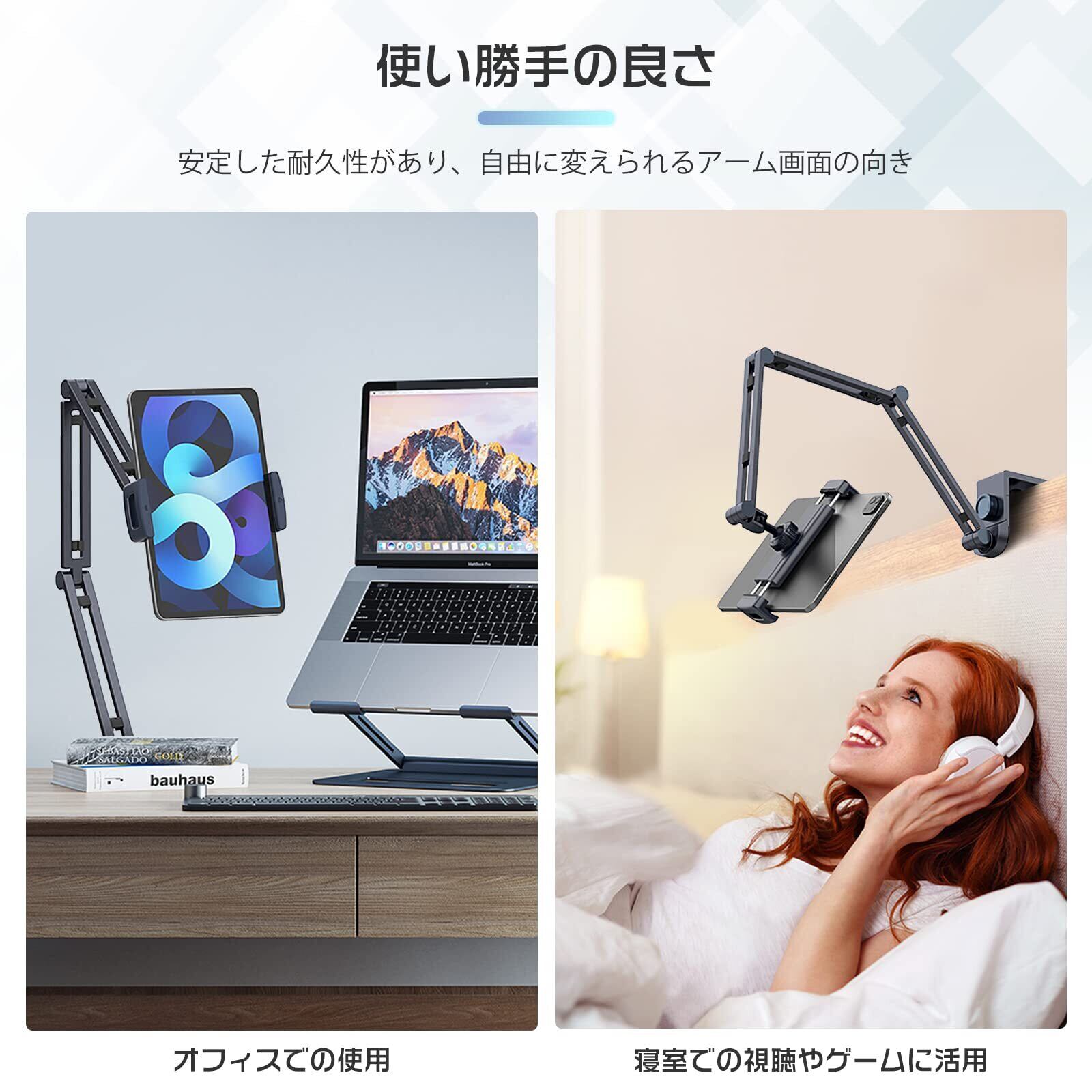 【垂直と水平平面両方共設置可】このipad アーム スタンドはオンライン授業で役立つ一品。枕元の壁だけでなく、デスクトップにも取り付けることができます。横になってスマホやタブレット見る時、大勧めです。タブレットを長時間で使用可能。【いろんな場所に対応】会議、インタビュー、視聴、ゲームなどに快適なエルゴノミクスデザインを採用。 適切な高さに調整します。