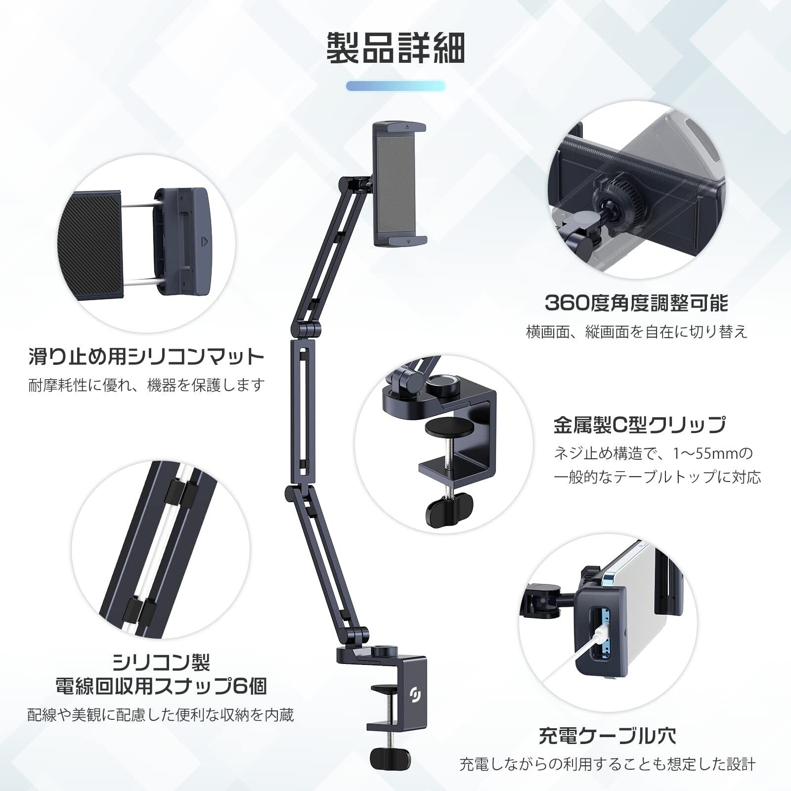 【六つの回れる関節、自由に調整できる】 最新のipad スタンド アームはろくつの回れる関節と自由に回る金属ダブルボールを備えて、普通なブラケットより、一層柔軟になります。4段式のアームで角度を自由に調整でき、一般的なアームよりも自由度が高く、より好きな角度に固定でき、最も快適な視角を調整できます。使わないときには折りたたんでおけます。収納後のサイズも小さい。