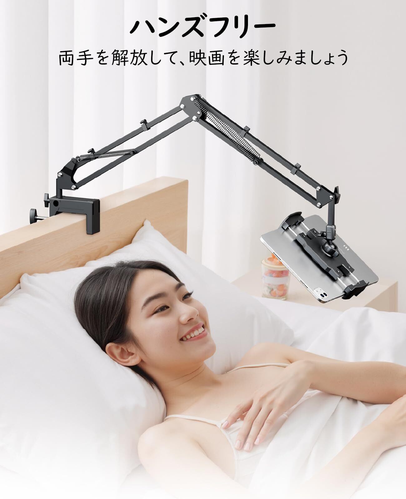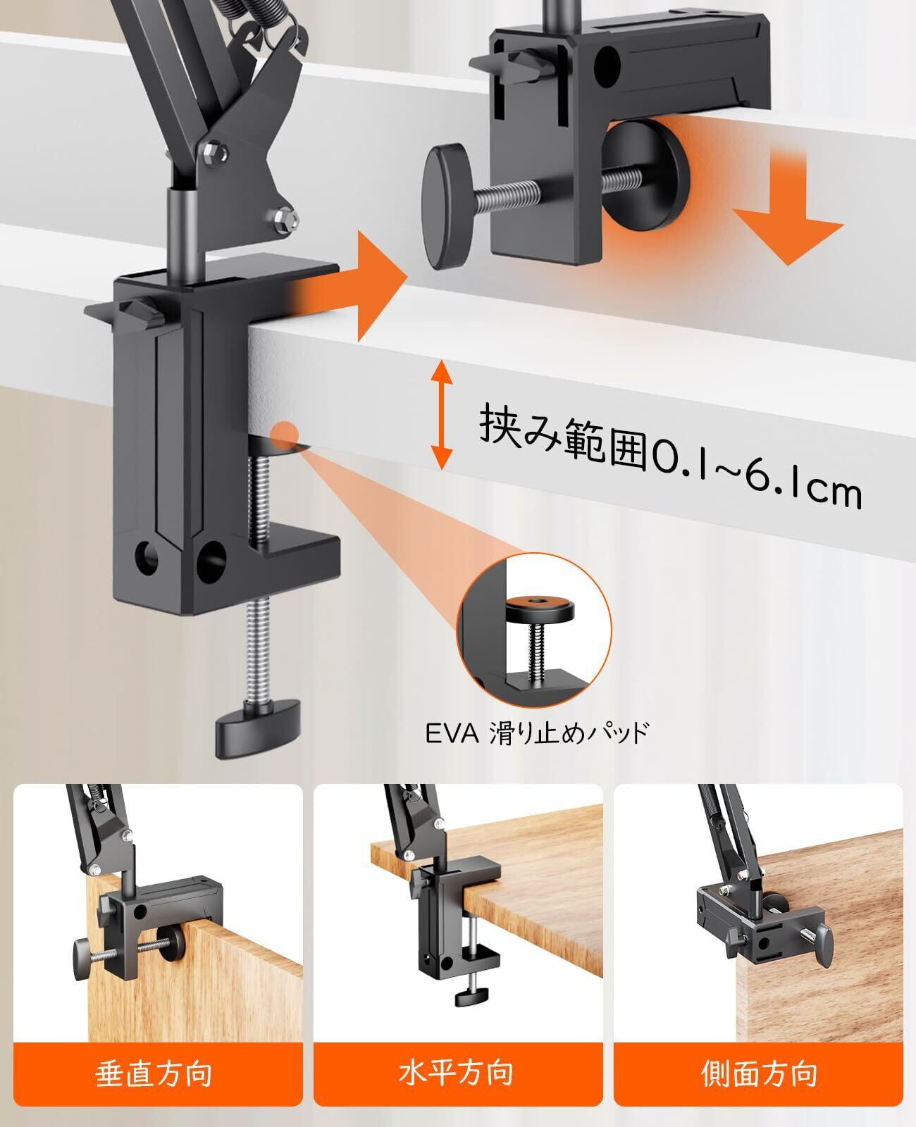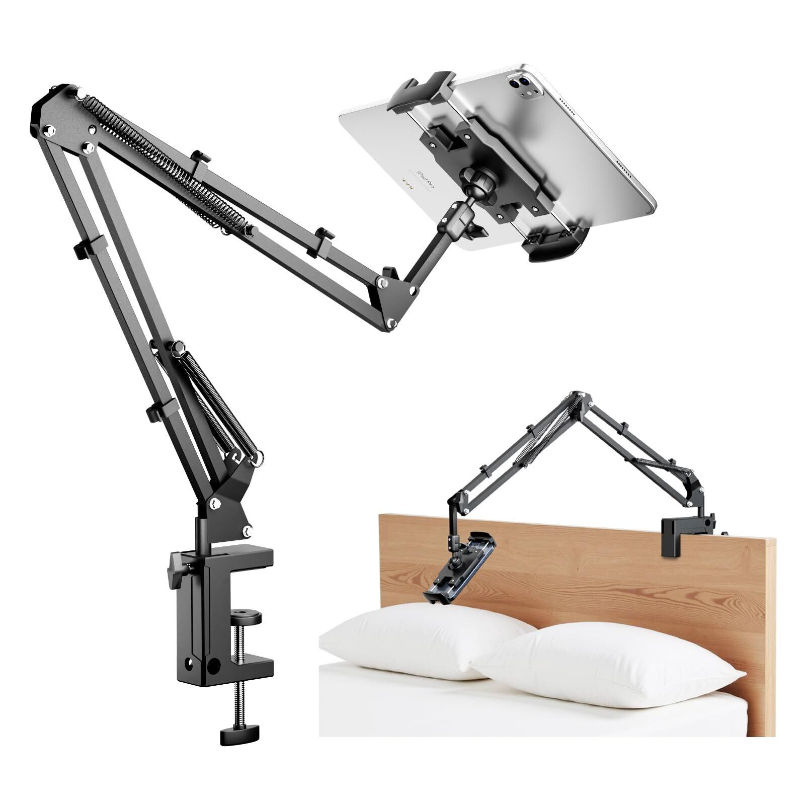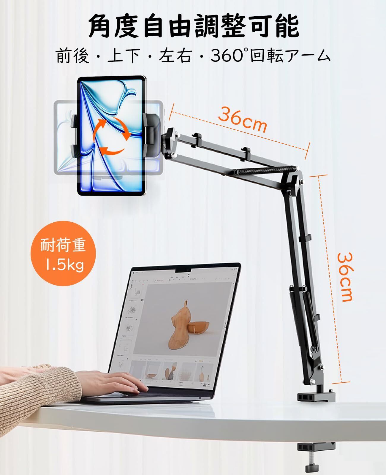 【垂直と水平設置可能なクランプ】ベッドサイドの垂直面だけでなく、デスクなどの水平面にも対応できます。横/縦対応クランプ台座と全体的金属製の炭素鋼アームで、頑丈なアームスタンドは超強い4つスプリングを備えており、アームを更に固定でき、安定性が抜群。最大荷重1.5kg、ほぼいずれかのタブレットやスマホに耐えることができます。
