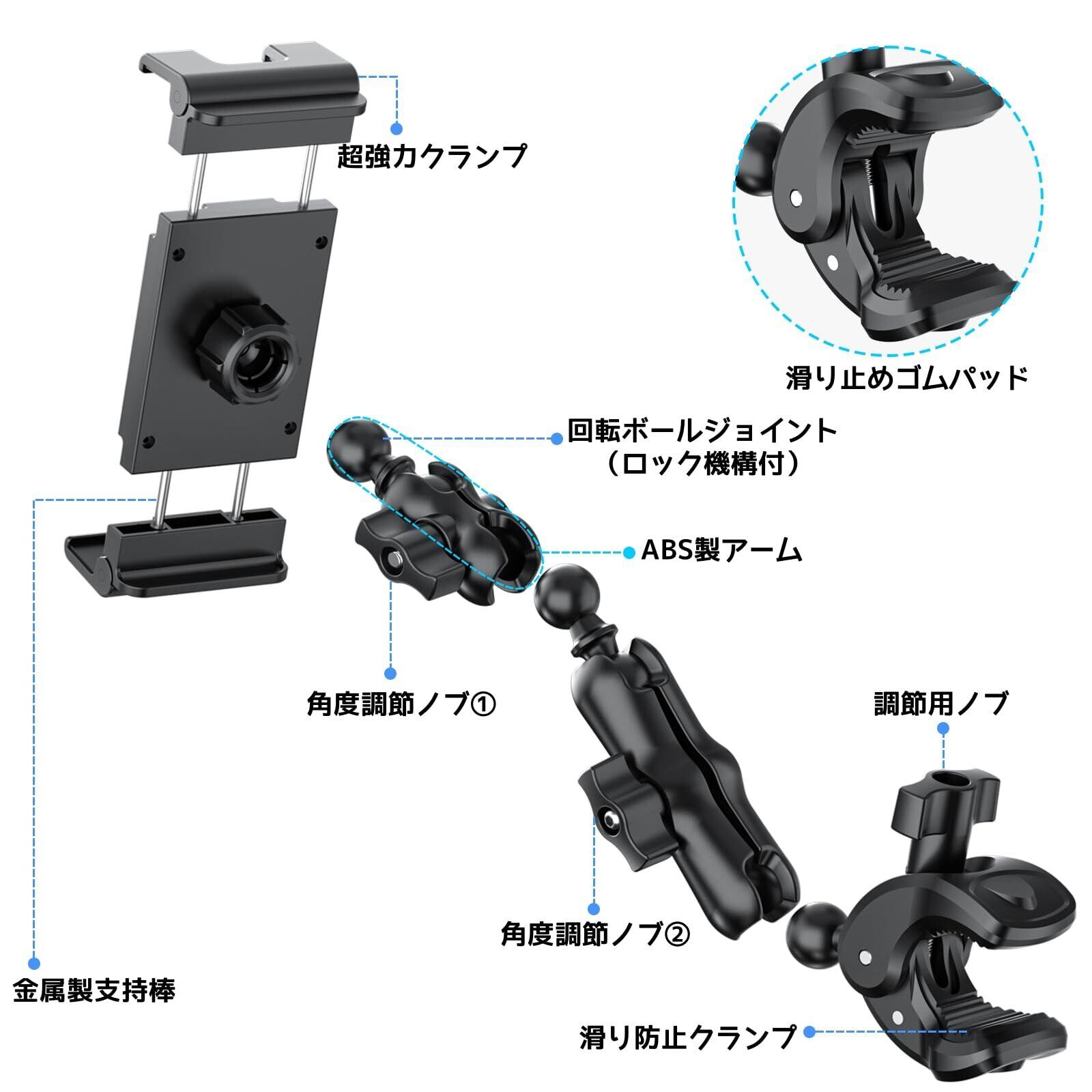 【簡単な取り付け・頑丈で長持ち】アームのノブを回すだけで両端のアームをクランプに簡単に接続でき、その後アームのボールヘッドをホルダー側の溝にはめ込み、ナットを締めてしっかり固定すれば、あとはクランプを取り付けたい場所にセットするだけで設置完了、すぐに使い始めることができます。取り付けは工具不要で、誰でも簡単に行えるのが特徴です。アーム部分には耐久性に優れたABS素材を使用し、強度を高めるためにボールヘッドの直径も20mmにアップグレードされています。また、タブレットホルダー本体には金属製ロッドを内蔵しており、長時間の使用でも劣化しにくく、しっかりとした安定感と耐久性を兼ね備えています。