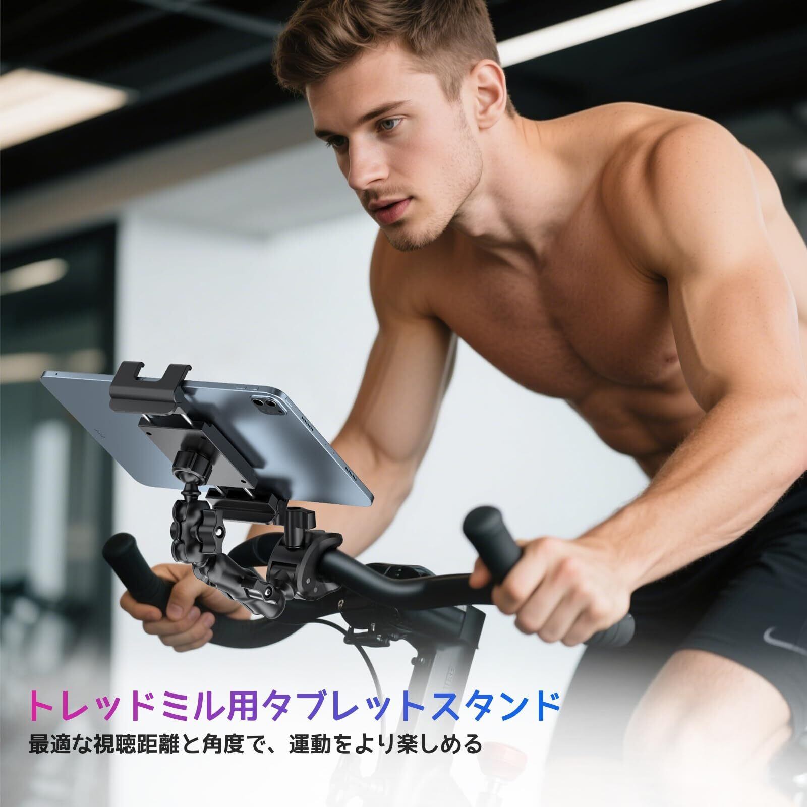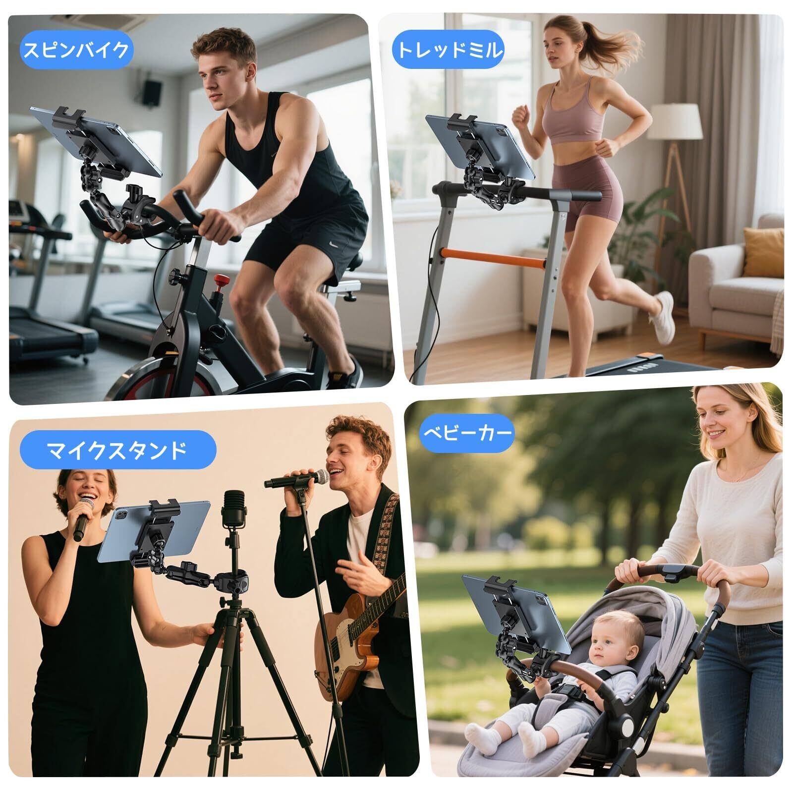 【多用途対応のタブレットホルダー】本タブレットスタンドのクランプは幅1.5cm(0.59インチ)~5cm(1.97インチ)まで調節可能で、マイクスタンドやスピンバイク、ランニングマシン、クロストレーナー、自転車、バイクのハンドルバー、ベビーカー、ポールなど、さまざまな機器にしっかりと取り付けることができます。マイクスタンドに装着すれば弾き語りをしながら譜面を確認でき、フィットネスマシンに取り付ければ運動しながら動画を楽しめます。また、自転車やバイクに取り付けることで、ナビを確認しながら安心して走行することも可能です。直径1.5~5cmの丸型バーに対応しており、これ一台で多様なシーンに活躍する非常に便利な2段式タブレットホルダーです。