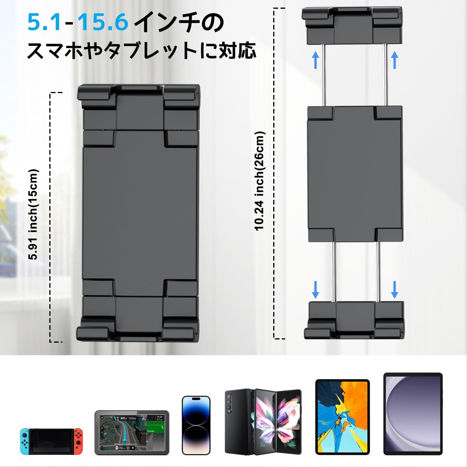 【5.1~15.6インチのデバイスに対応、最高の互換性!】タブレットホルダーは材質だけでなく、互換性も大幅に進化しました。従来の7~11インチ対応から、5.1インチから15.6インチまでのデバイスに対応可能に。【5.1~15.6インチのデバイスに対応、最高の互換性!】スタンドは材質だけでなく、互換性も大幅に進化しました。従来の7~11インチ対応から、5.1インチから15.6インチまでのデバイスに対応可能に。iPhone16~8シリーズやその他のAndroidスマートフォン、iPad Pro 12.9/11/10.5/9.7、iPad Air、iPad Mini、Galaxy Tab、Galaxy Z Flip/Fold、Fire HD、Surface Pro/Goなどのタブレットにも対応しています。また、4つのアームの厚みは2cm(0.79インチ)あり、ケースを装着したままでもしっかりと固定できます。