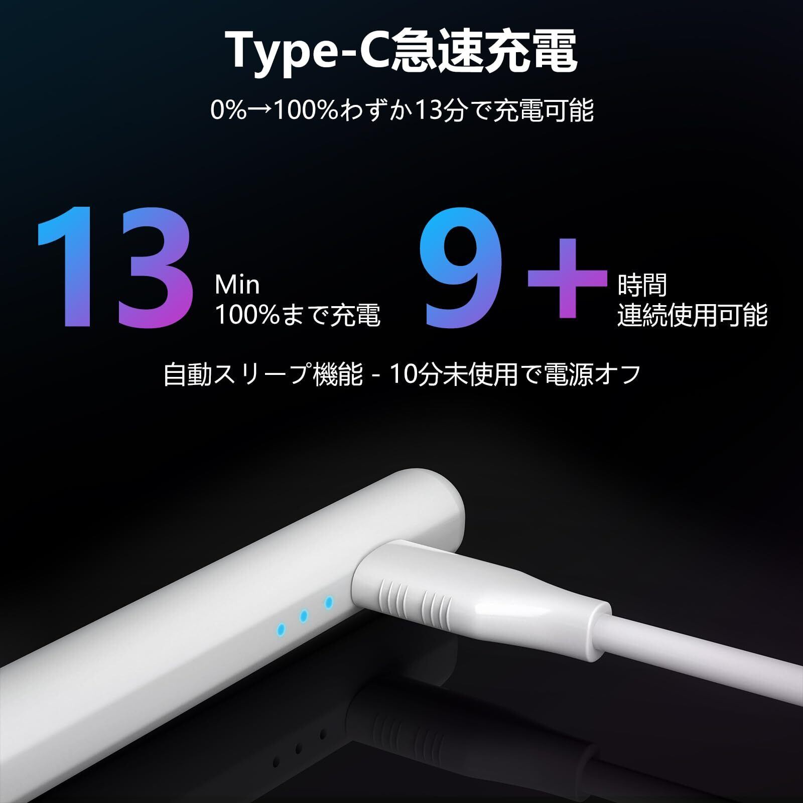 【Type-C急速充電】あっぷるへんしる互換充電式タッチペン新登場!驚異の13分高速充電で9時長時間使用可能。忙しい時でも、たった2分の充電で1時間使えるから安心。電量表示を示す3つのインジケーターライトがあります。このiPad用スタイラスペンは3つのライトにより電量状況が一目瞭然で非常に便利です。アップル ペンシルは10分間操作がないと自動スリープモードに切り替わり、バッテリーを節約し、抜群の省エネ性能で、仕事から趣味まで長時間快適に使えます。