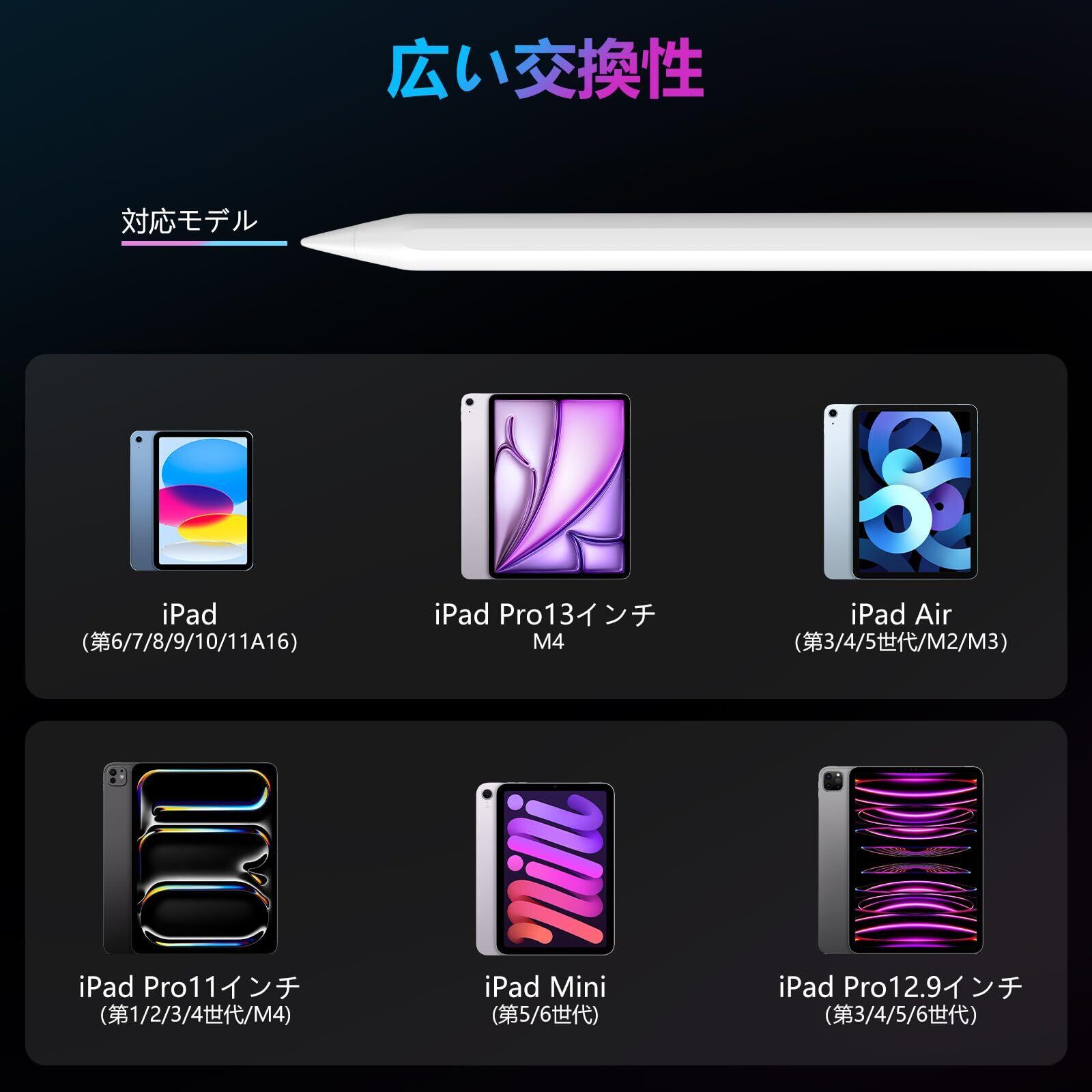 【2018年以降のiPad対応タッチペン】Mixoo iPadペンシルは、以下のiPadモデルと互換性があります:iPad 第6/7/8/9/10/11(A16)世代、iPad Air 第3/4/5/6/世代、iPad Air 11/13インチ(M2/M3)、iPad Pro 11インチ第1/2/3/4世代、iPad Pro 12.9インチ 第3/4/5/6世代、iPad Mini第5/6世代、iPad Pro 11/13 インチ(M4/M5)適用。注:iPad mini第7世代と互換しません。