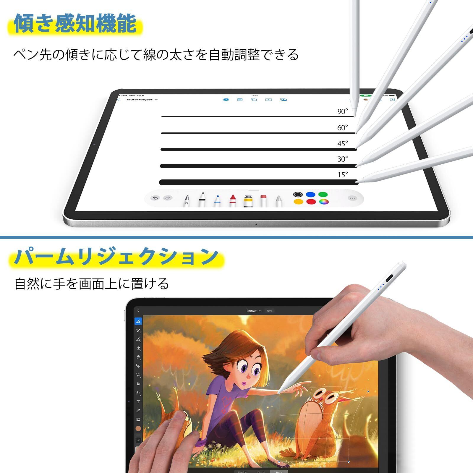 ✏【傾き感知&パームリジェクション&磁気吸着機能】 HATOKU ipad用タッチペンは、ペン先の傾きに応じて線の太さを自動調整できます。イラストや絵を描く際に最適です!パームリジェクション機能も搭載されており、画面上に自然に手を置けます。磁気吸着機能が備わっており、紛失の心配が少なく、収納や持ち運びが便利です。(ご注意:傾き感知機能対応アプリ:SketchBook、procreate、paper、Noteshelf)
