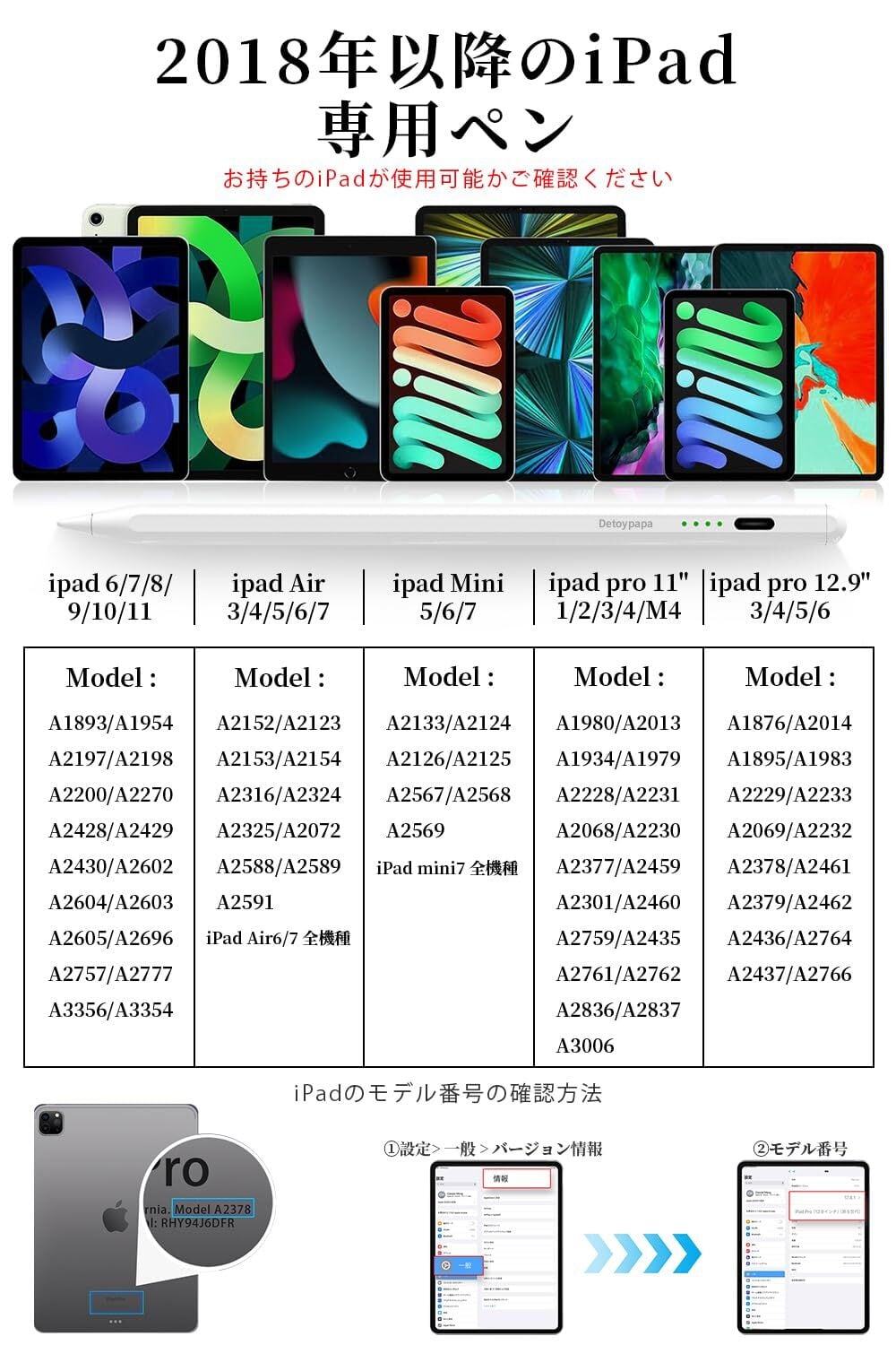 【iPad 2018-2025年モデルに対応】Detoypapaのタッチペンは、以下のiPadモデルと互換性があります:iPad 第11世代/第10世代/第9世代/第8世代/第7世代/第6世代、iPad Air 第7世代/第6世代/第5世代/第4世代/第3世代、iPad Pro 11/13インチ(M2)、iPad Mini 7/6/5、iPad Pro 11インチ(全世代)、iPad Pro 12.9インチ(第6世代/第5世代/第4世代/第3世代)、iPad Pro 11/13インチ(M4)。ご注文前に、対応するiPadモデルを必ずご確認ください。