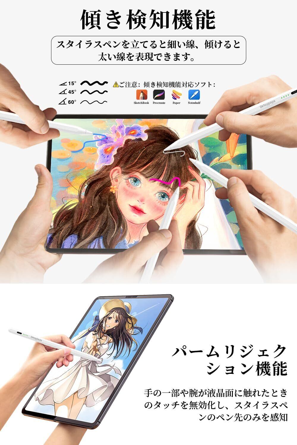 【パームリジェクション&傾き感知機能】Detoypapaのあいぱっと タッチペンは、パームリジェクションと傾き感知機能を備えており、より快適で自然な書き込みや描画体験を提供します。パームリジェクション機能により、画面に手のひらを置いても誤タッチが発生しません。傾き感知機能により、スタイラスを異なる角度で使用することで、線の太さやシェーディングのバリエーションを正確に制御できます。
