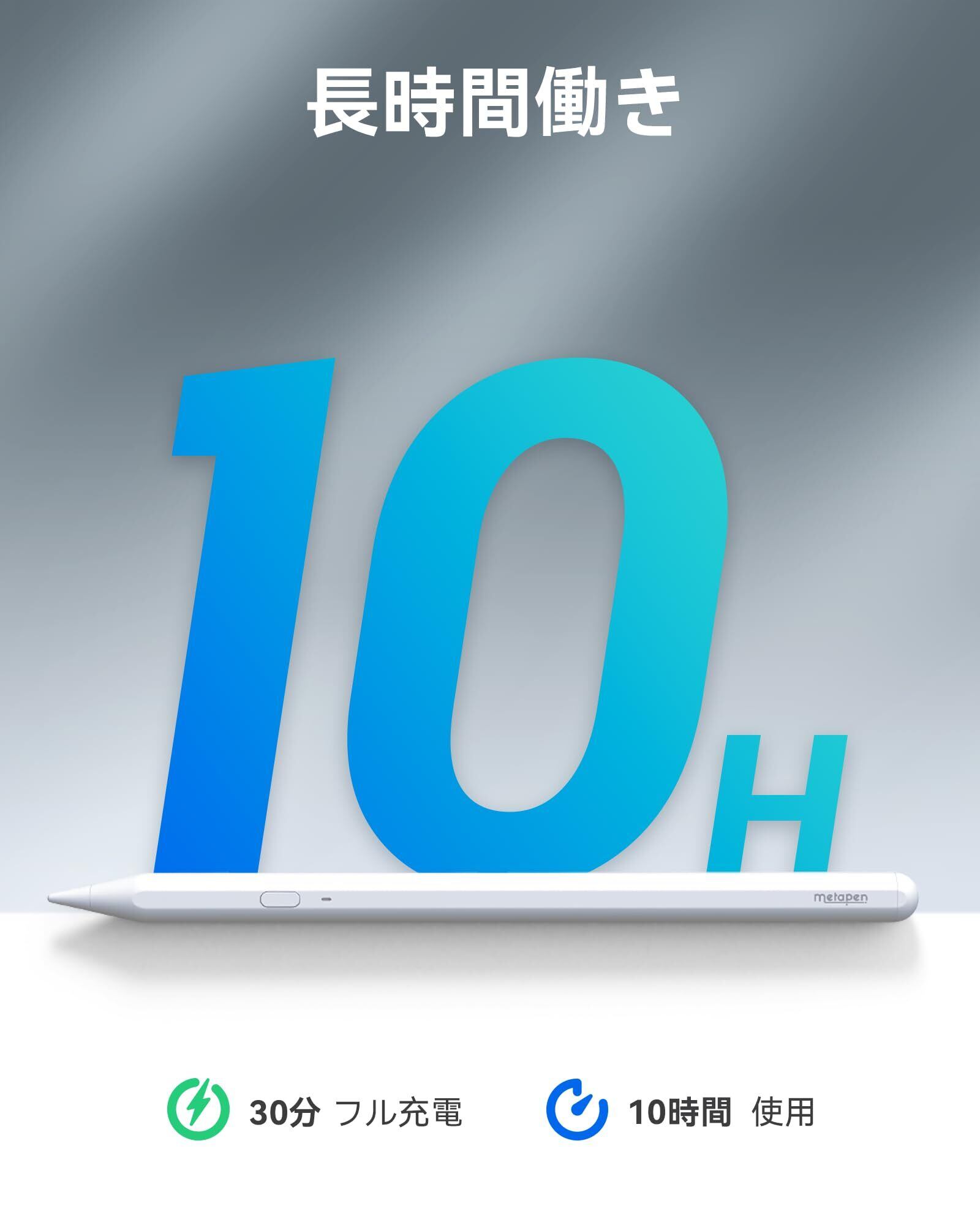 ・2倍高速充電&長寿命のバッテリー・最新改良版Metapen A11は、たったの30分の充電で、8時間以上使用できます。1分の充電で50分、4分の充電で2時間の使用が可能です。充電効率は、他のペンと比較しても圧倒的です。Metapen A11の超急速充電と長寿命のバッテリーを楽しんでください、バッテリー切れの心配はありません。