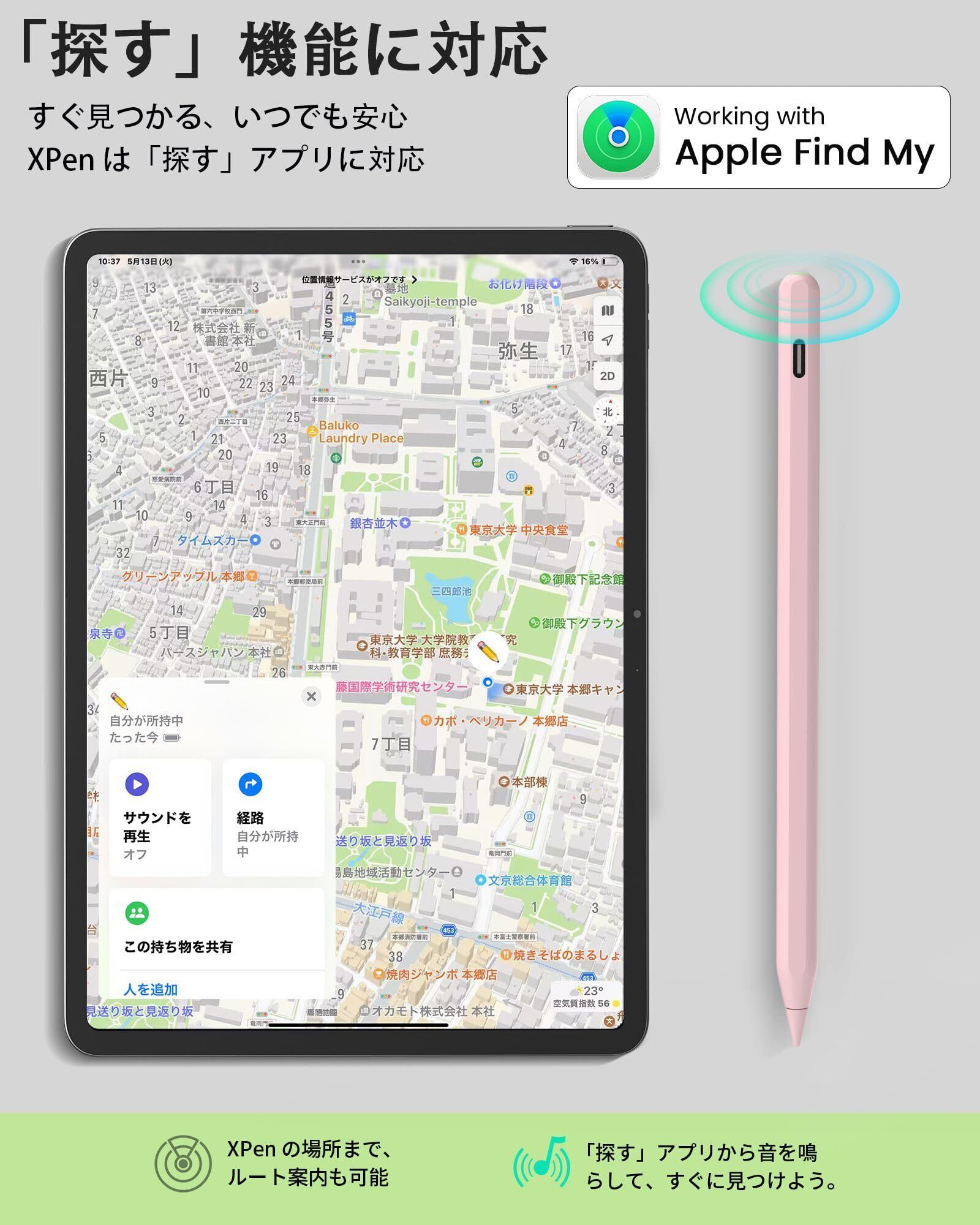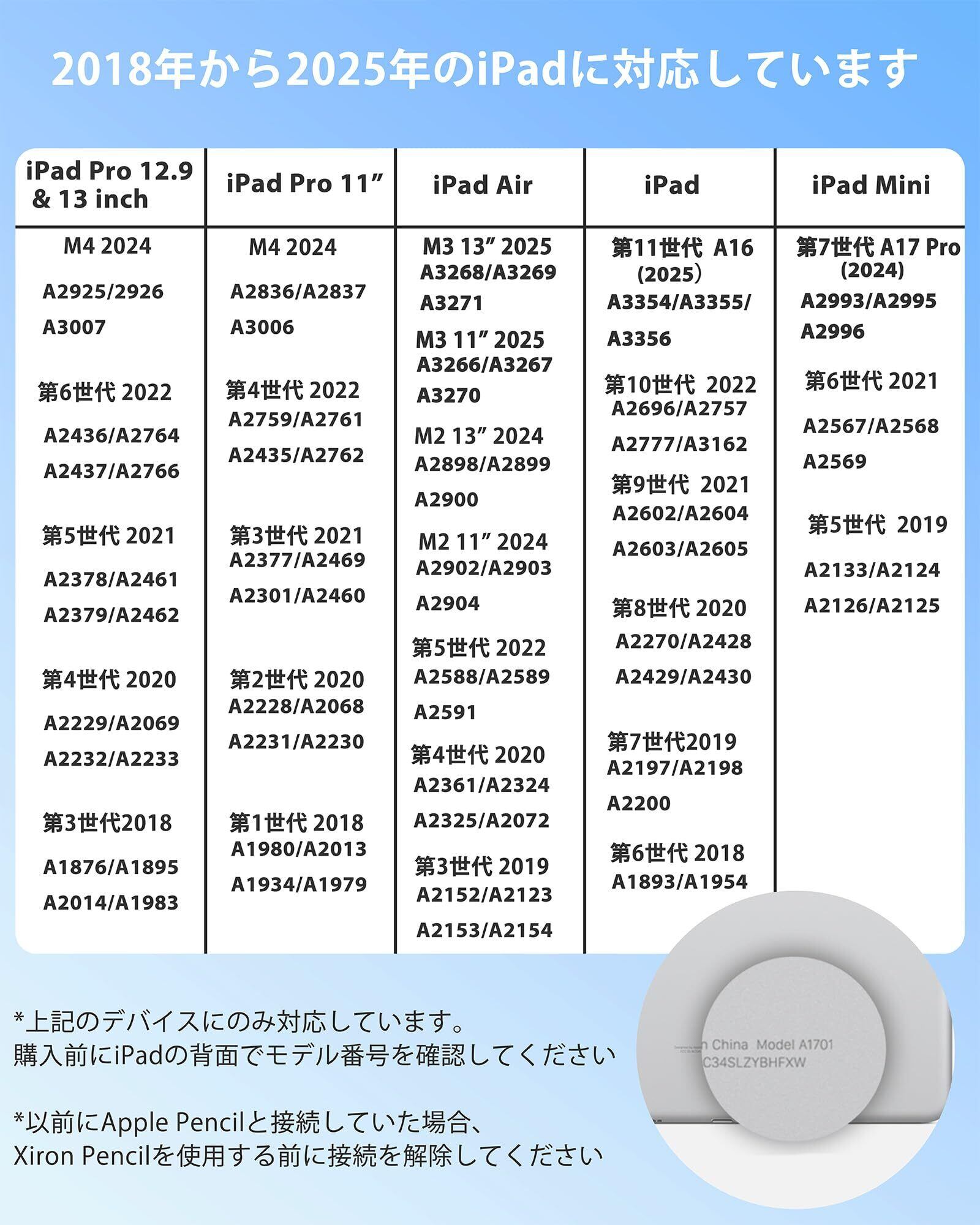 【高精度位置特定 – 「探す(Find My)」アプリ対応】 iPad タッチペンは「探す(Find My)」アプリに対応し、iPadやiPhoneに登録可能。万が一紛失した際も、アプリで位置を特定し、内蔵スピーカーから音を鳴らして簡単に見つけられます。日常使いでの紛失防止機能として安心でき、タッチペン iPadをお探しの方に最適です。 このペンシル iPadは、2018年~2025年の幅広いモデルに対応。具体的には、iPad Air ペン(11/13インチ M2/M3)、iPad Pro(11/13インチ M4)、iPad 第11世代 A16 タッチペン、ipad 第10世代 ペン、iPad 9世代 ペン、第8・7世代、iPad mini 7 A17 Pro / 6 / 5世代など、多機種と互換性があります。ipad 10世代 ペンやipad a16 ペンシルを求める方にもおすすめです。購入前に【設定 > 一般 > 情報】からモデル番号をご確認ください。