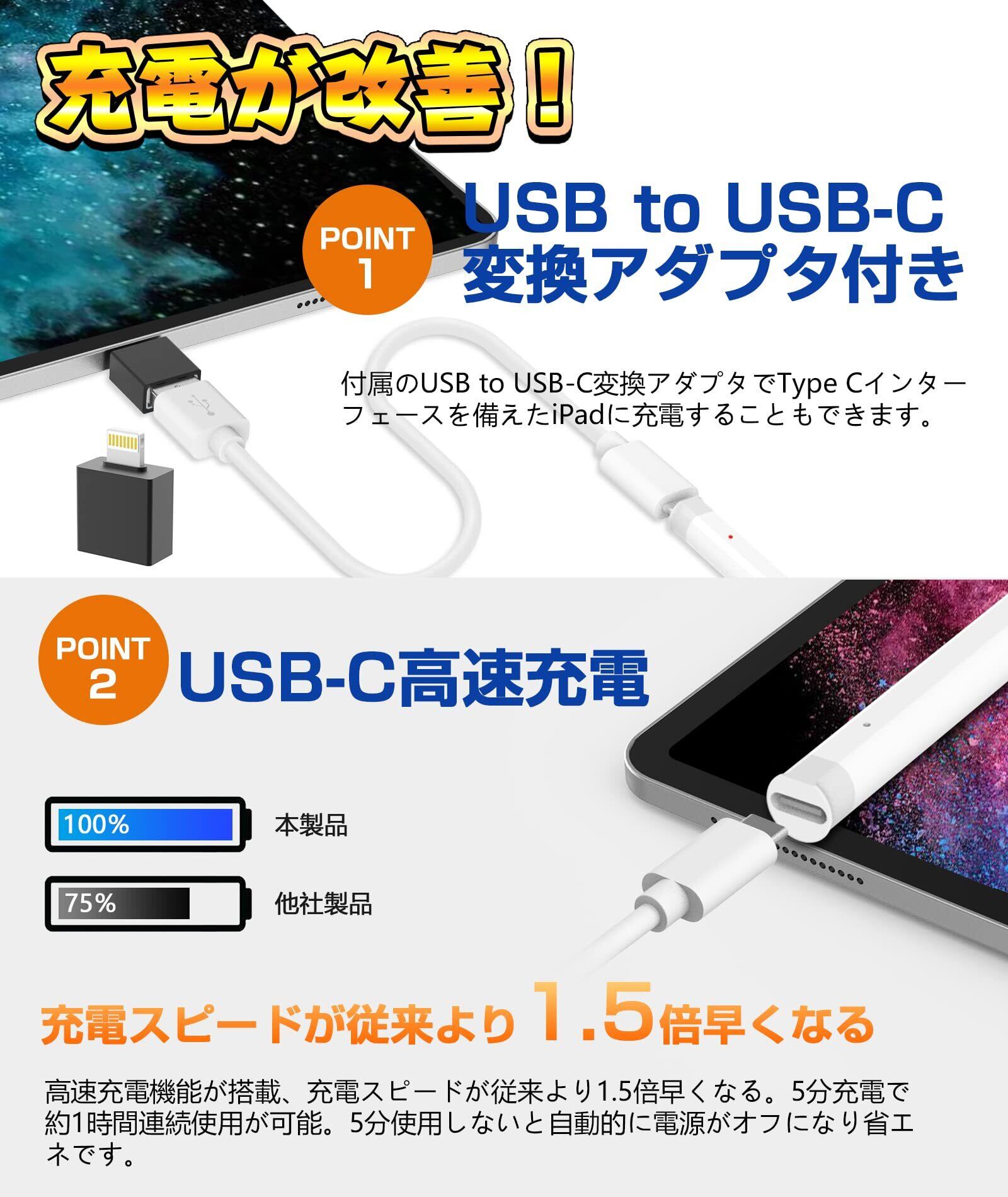 【急速充電&iPadから充電可能なUSB-C変換アダプター付き】:●RICQDのiPadペンシル「S10」は、最先端の急速充電技術を搭載し、従来のiPad用タッチペンの1.5倍の速さで充電できるし、僅か5分間の充電で約1時間使用できます!また、付属のTYPE-C充電ケーブルとUSB-TYPE-Cアダプタを使えば、外出先でもiPadのTYPE-Cポートから直接充電できます。