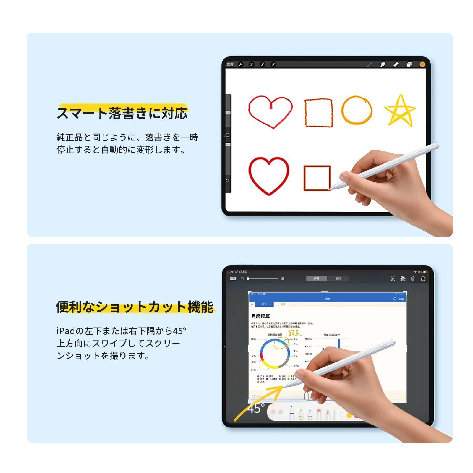 【磁気吸着&誤作動防止機能】このiPad ペンシルは他社の従来品と比べて、超強力吸着機能付き、iPadにしっかりとくっついて、保管と持ち運びが簡単になります。誤作動を防ぐパームリジェクション機能は手を自由に画面上に置いたままスラスラ書けます。長時間の使用でも、手のストレスを感じません。ご注意:ワイヤレス充電機能に非対応