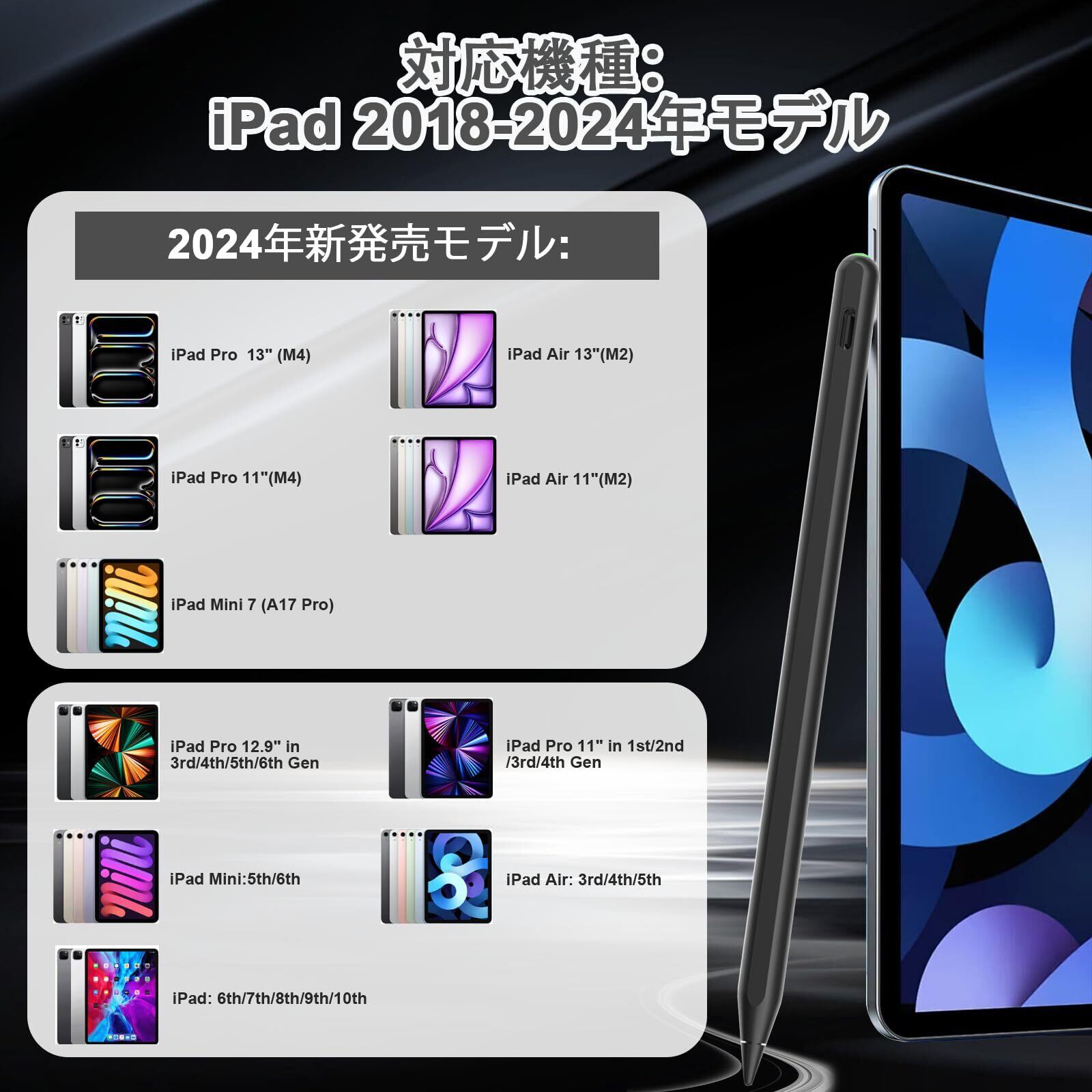 Pencil 第2世代 iPad 2018-2024用 磁気ワイヤレス充電付き Apple iPad Pro 13インチ(M4)/12.9インチ/11インチ、iPad Air 6(M2)/5/4/3、iPad Mini 7(A17 Pro)/6/5、iPad10/9/8/7/6 ブラック