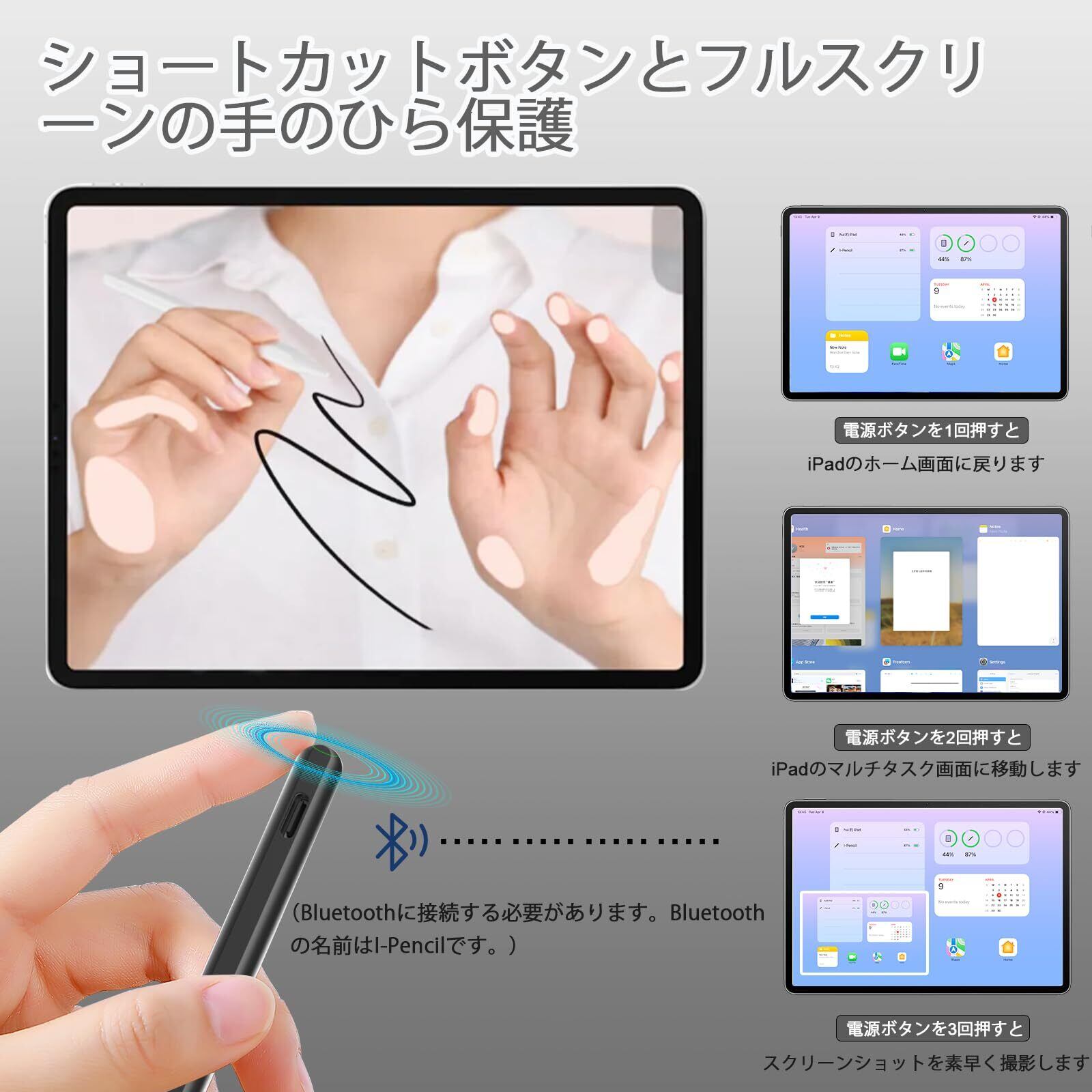 時間節約ショートカットボタン:PeaboniのiPad 9世代用第2スタイラスペンは、Apple Pencil Pro 13インチ(M4)用のApple Pencil Pro 第2世代と同じです。Bluetoothに接続した後、上部のボタンをタップしてショートカット機能を実装します。ワンタップでメイン画面に戻ります。ダブルタップしてアプリの選択ページに戻ります。連続して3回クリックするとすばやくクリックできます。 スクリーンショットを撮る