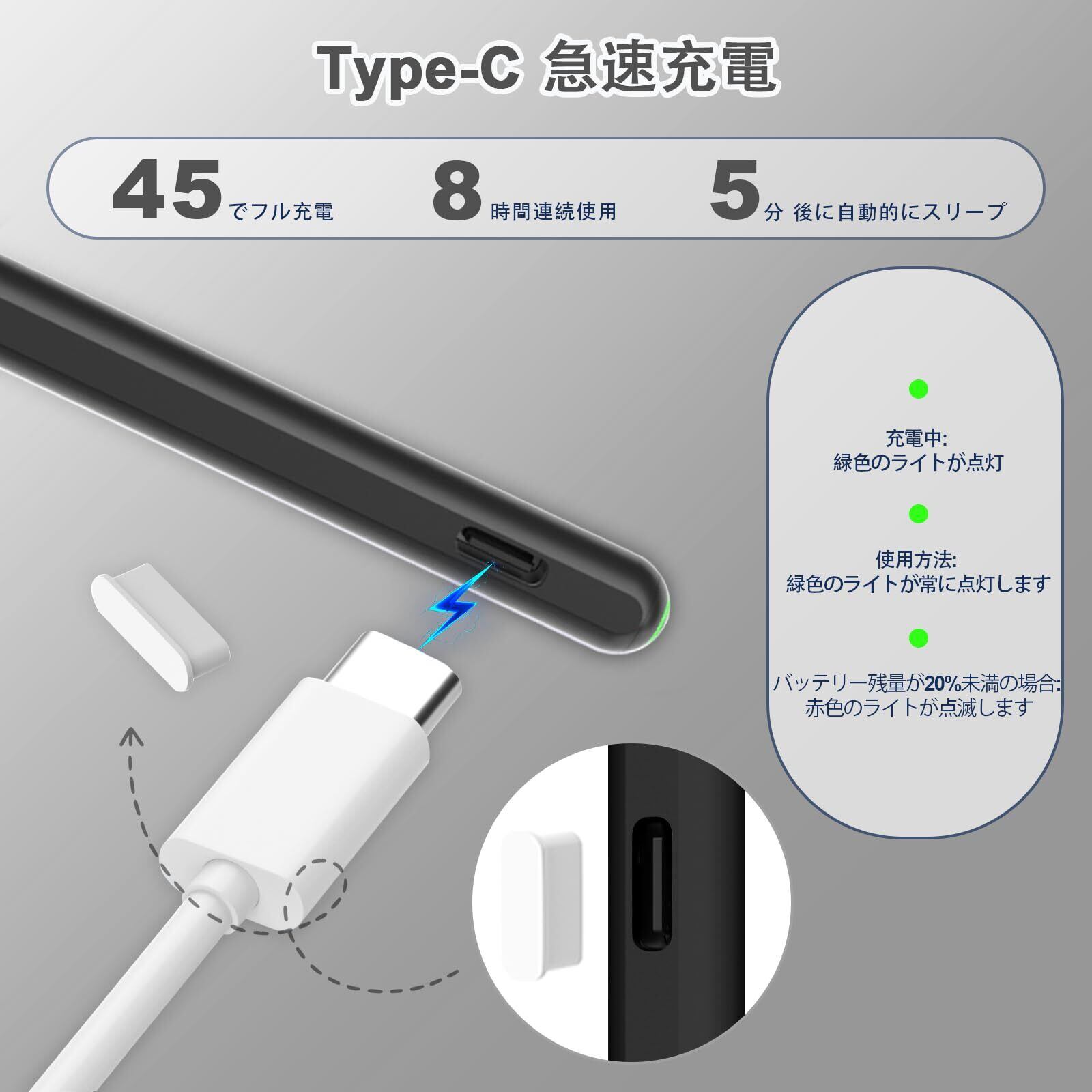 USB-C高速充電互換性:Apple Pencilの第2世代と同じアップグレードスタイラスペンシルは、USB-C高速充電をサポートし、iPad 2018-2024年モデルと互換性があります:iPad Pro 13インチ(M4)/12.9インチ/11インチ、iPad Air 6(M2)/5/4/3、iPad Mini 7(A17 Pro)/6/ 5、iPad10/9/8/7/6および。 30でフル充電 数分、最大8時間の連続使用と電源表示:充電:緑色のライトが呼吸、使用:緑色のライトが点灯したまま、20%未満の電力:赤色のライトが点滅します。