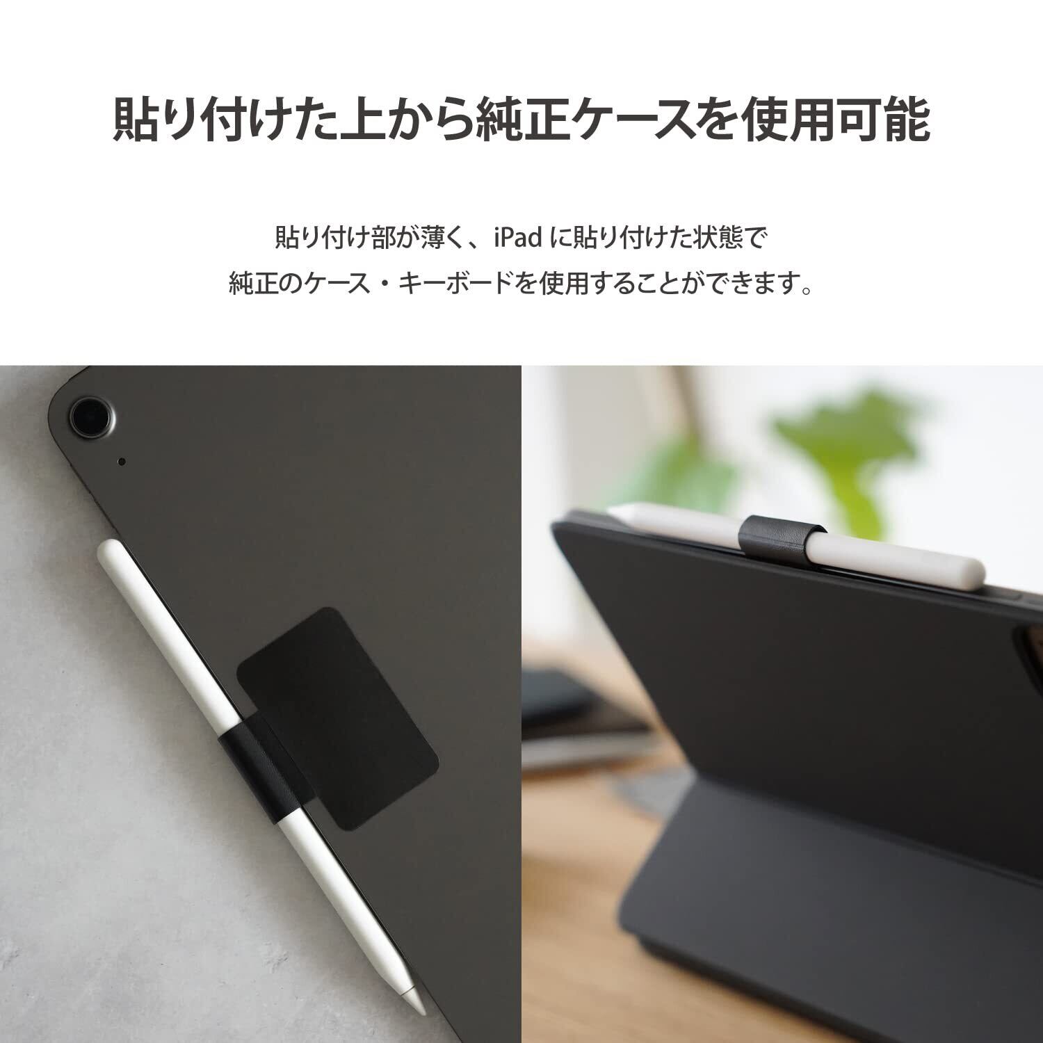 【薄型設計】ホルダー部は約0.5mmと薄く、Apple Pencil (第2世代)を装着したまま充電することができます。貼り付け部も薄く、iPadに貼り付けた状態で純正のケース・キーボードを使用することができます。※貼り付け部の薄さ約1.1mm