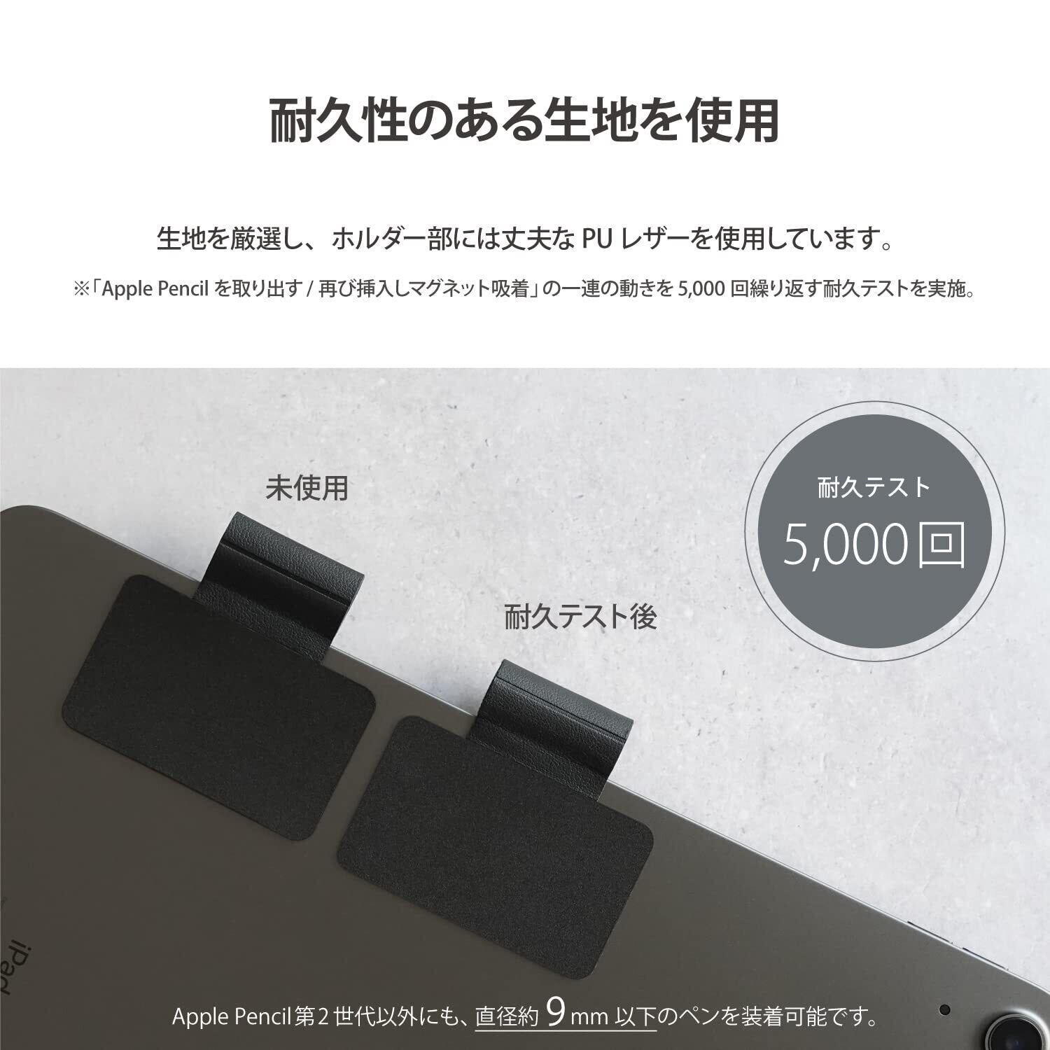 【耐久性のある生地】ホルダー部には耐久性のあるPUレザーを使用しています。※「Apple Pencilを取り出す/再び挿入しマグネット吸着」の一連の動きを5,000回繰り返すテストを実施。