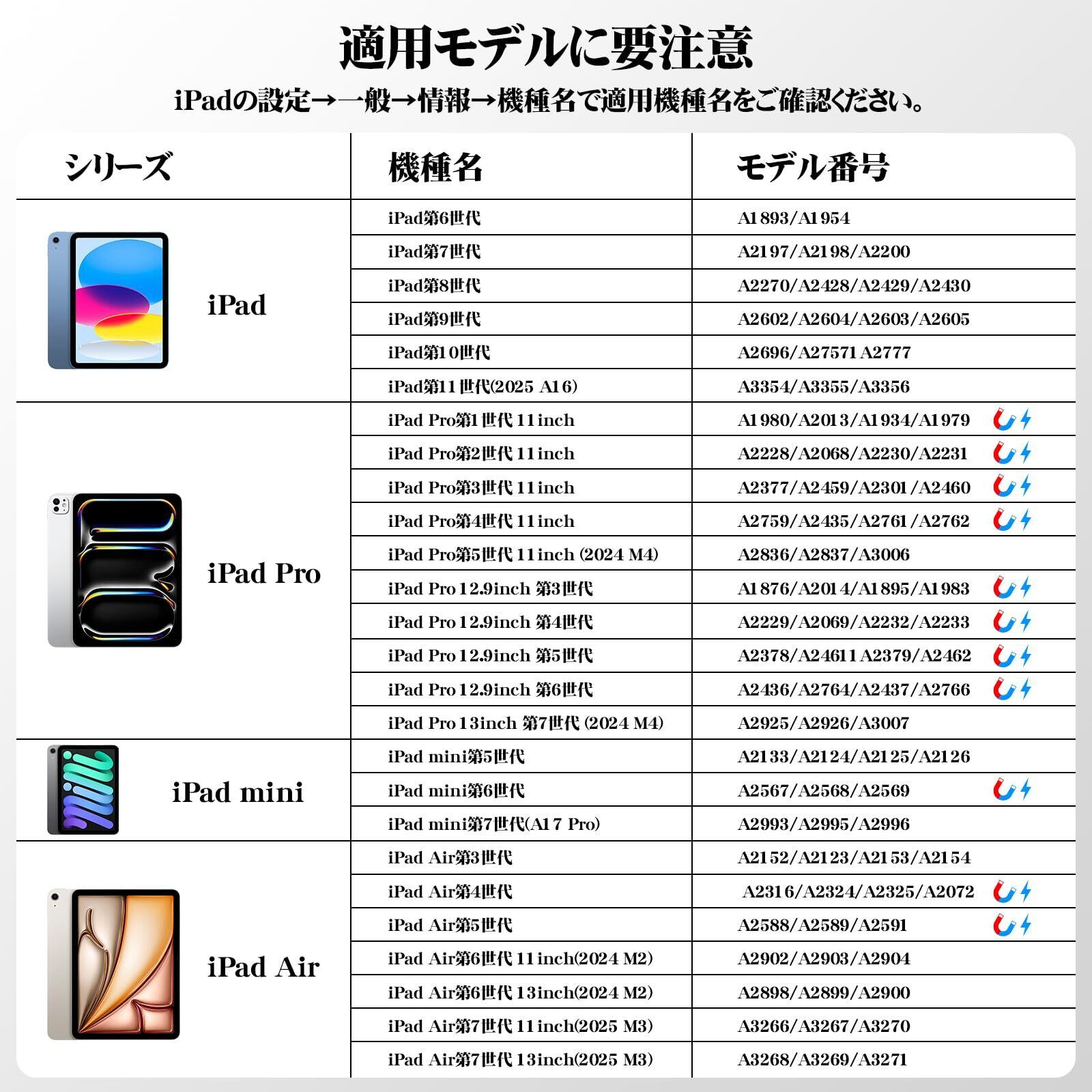 【適用機種を拡大】本ワイヤレス充電ペンシルは二種類充電方法があります。ワイヤレスチャージは磁気吸着に対応するiPadしか対応られません。※ご購入する前に必ず対応iPadの機種名をご確認ください。(確認方法:iPadの設定→一般→情報→機種名)対応機種名:iPad Pro 12.9 inch第3世代/第4世代/第5世代/第6世代、iPad Pro 11 inch第1世代/第2世代/第3世代/第4世代、iPad Air 10.9 inch第4世代/第5世代、iPad mini第6世代。Type-Cチャージは2018以後の全機種に対応られます。※無印iPad第7/8/9/10世代はワイヤレスチャージに対応しませんことをご了承ください。本製品は12ヶ月の期間を設けております。商品について、何かご不明なところがございましたら、是非ご連絡ください。