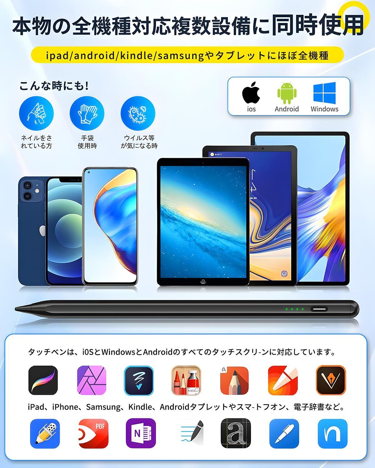■あらゆるデバイスで使える万能タッチペン!2025年革新版のこのスタイラスペンは、最新のType-C充電方式に対応し、iPad、iPhone、Androidなど多様なデバイスで快適な操作を実現します。軽量12gで、持ち運びにも便利です。