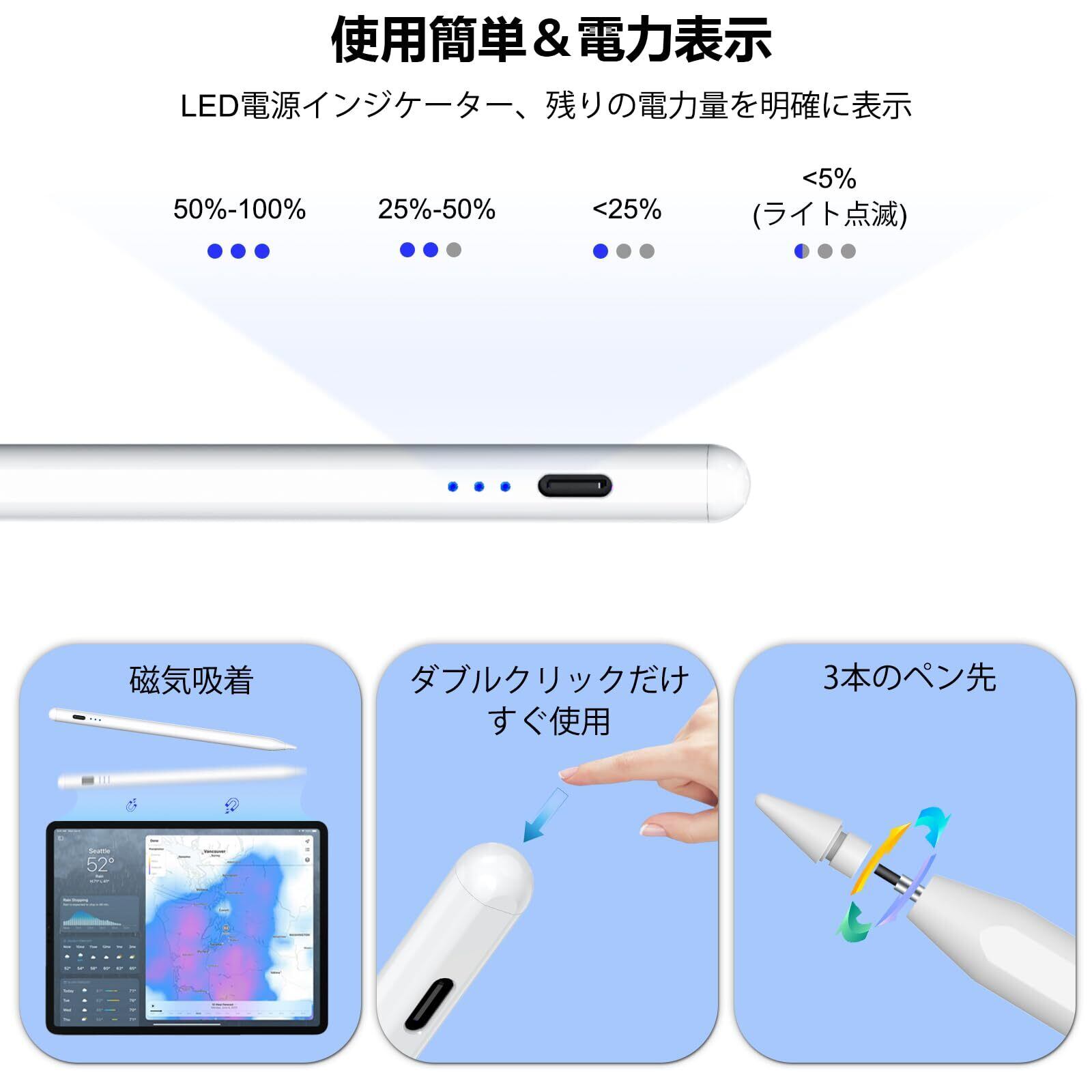 【使用方法】:ipad用スタイラスペンのダブルクリック、電源ON/OFF。【ペアリング不要】:Blutooth接続不要で、電源をオンにするだけですぐにご使用いただけます。【バッテリー残量表示】:「使用時」3つ点灯→70-100% / 2つ点灯→30-70% / 1つ点灯→5-30% / 1つ点滅→充電提示。バッテリー寿命を考えるなら、 1つ点灯の時すぐ充電してください。(電池残量20%へ99%の状態を維持 するのが適切)