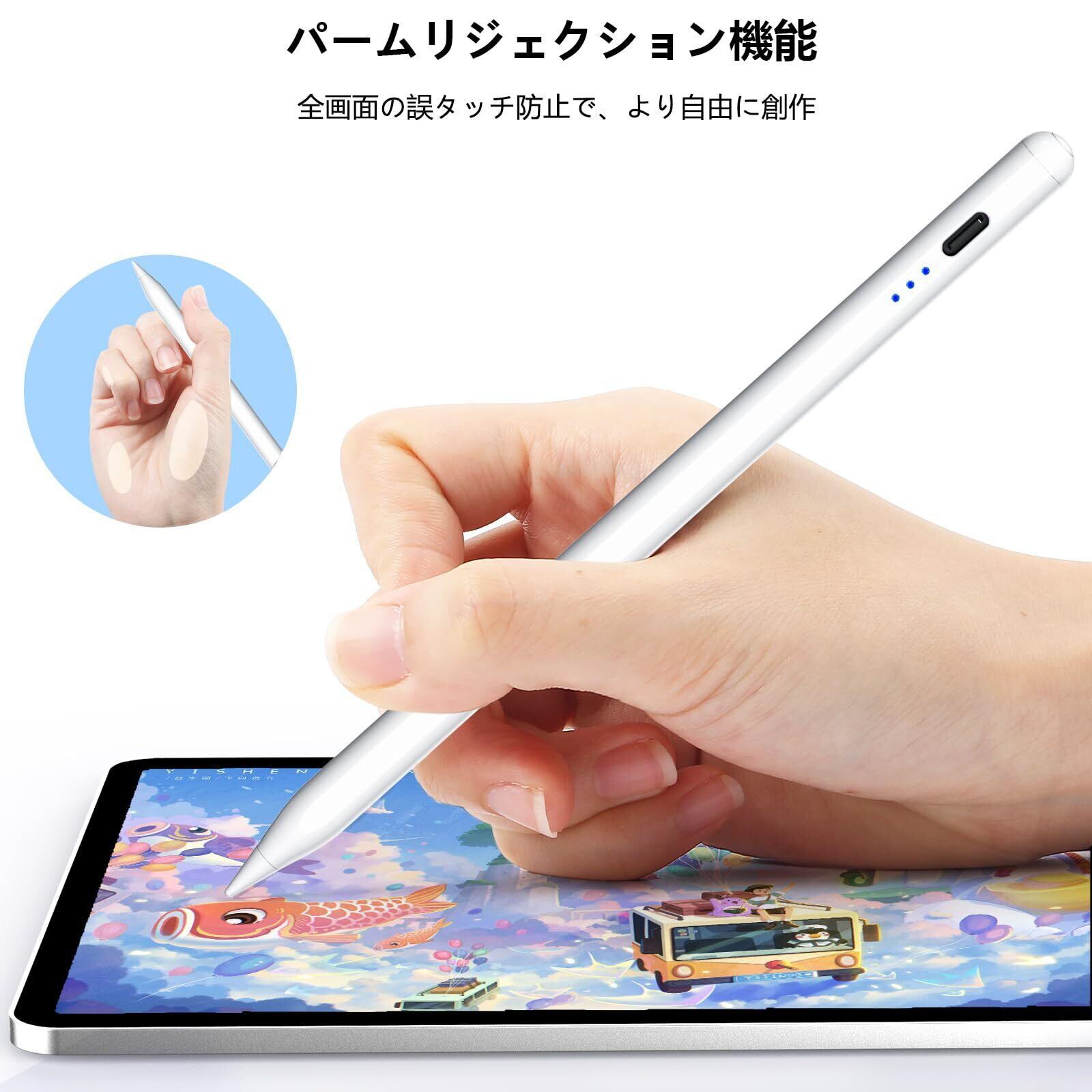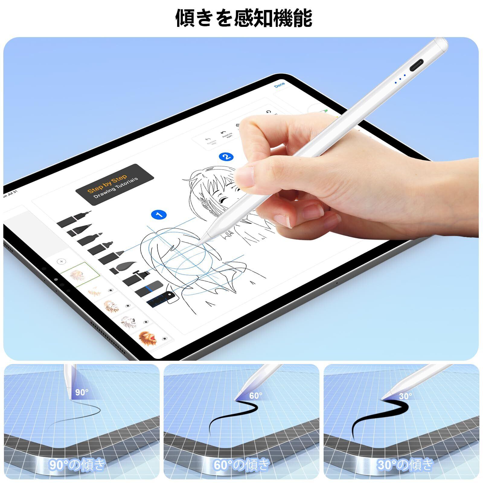 【磁気吸着機能】:本ipad用タッチペンはマグネットを内蔵しており、磁気吸着に対応したiPad側面に取付け可能です。勉強や仕事など、持ち運びに便利※ワイヤレス充電には対応しておりません。【傾き検知機能】:ipad用ペンシルを傾けることで、鉛筆のように線の濃淡を調節できます。(30度から90度の傾きを検知します。)【パームリジェクション対応】:アップルペンシルを画面に手を置いて作業できるため便利で、長時間の作業でも腕が疲れません。