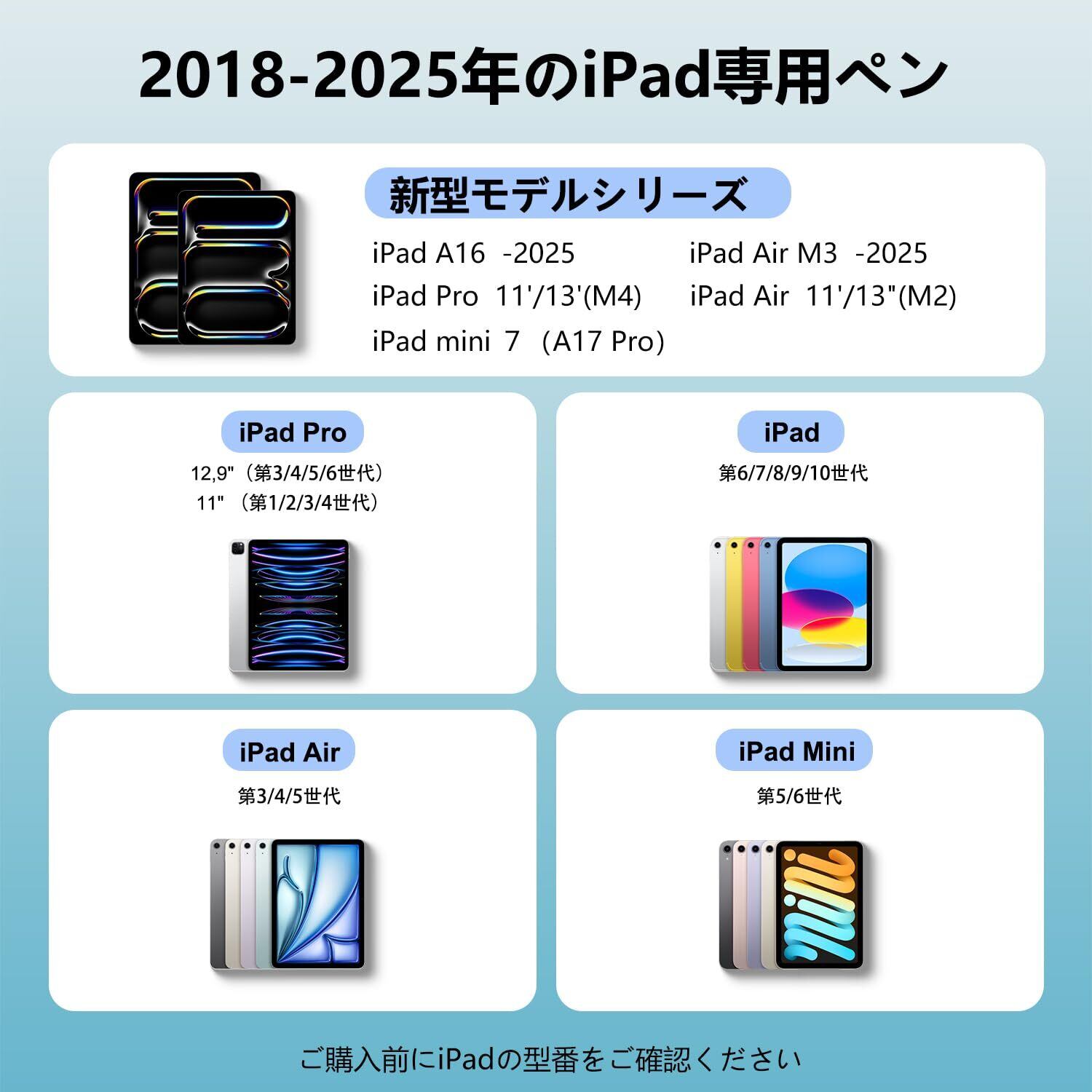 2018-2025年のiPadモデル:iPad Air (M3)、iPad A16、iPad Pro (M4)、iPad Air(M2)、 iPad Mini第5/6世代、 IPad 第6/7/8/9/10/11世代世代;、11… 表示を増やす